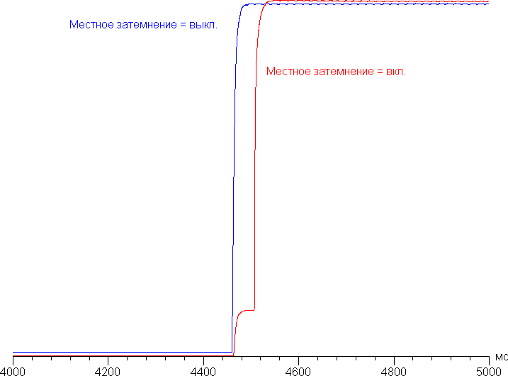 График ниже показывает, как увеличивается яркость (вертикальная ось) при переключении с черного поля на белое при включенной и выключенной функции локального затемнения: