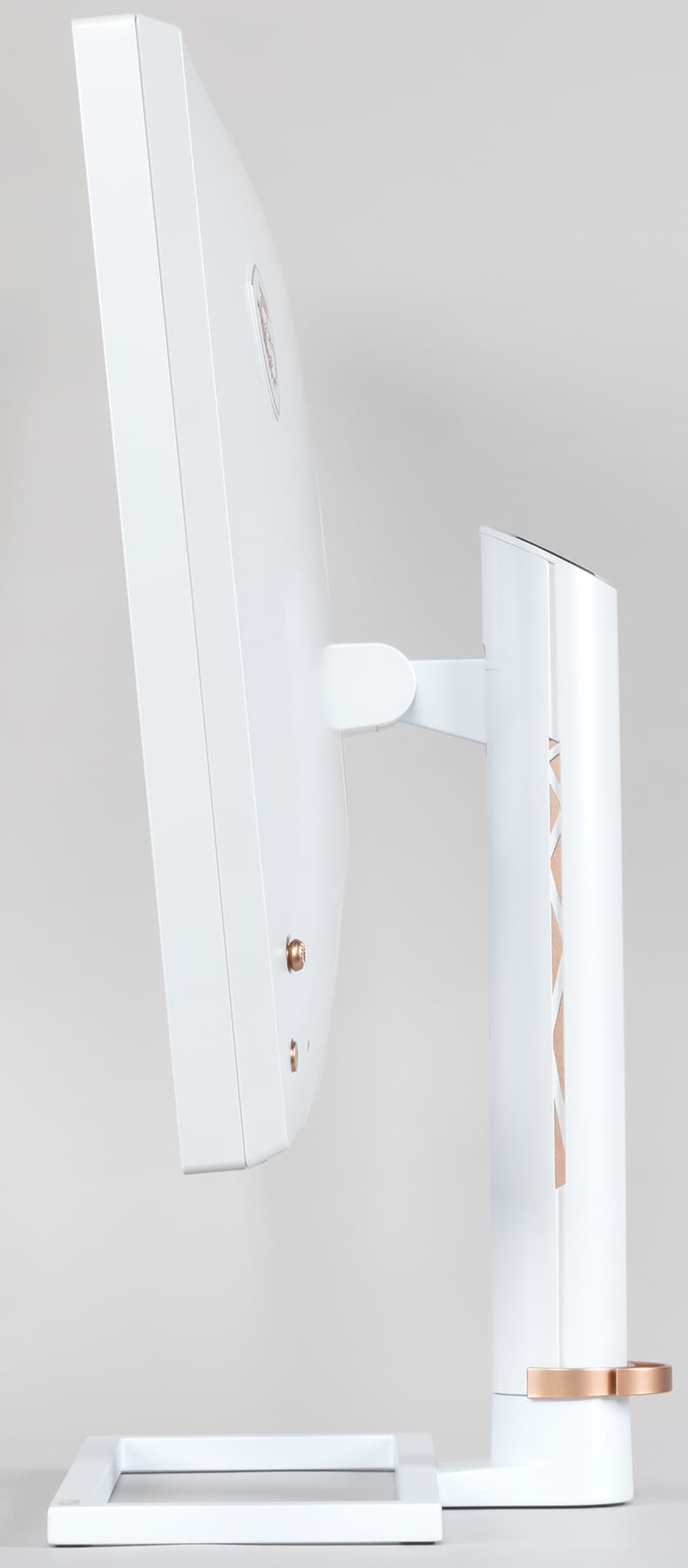 Стойка имеет фиксированную высоту, но подпираемый пружиной механизм со стальным рельсовым шариковым подшипником обеспечивает вертикальное перемещение крепежного узла, на который крепится блок экрана. В итоге легким движением руки экран можно установить на нужную высоту. Крепежный узел оснащен шарниром, позволяющими немного наклонять блок экрана вперед (на 4,6° согласно нашим измерениям) от вертикального положения и больше наклонять назад (на 20), а на шарнире в нижней части стойки блок экрана можно и поворачивать вправо-влево (±35° по данным производителя). Монтажная площадка подставки жестко крепится к блоку экрана четырьмя винтами (что сейчас нетипично), и закрывается снаружи пластиковым кожухом. На пластиковом кожухе стойки есть декоративные вставки из пластика с золотистым покрытием, а на верхнем торце стойки — заглушка из пластика с серебристым покрытием.