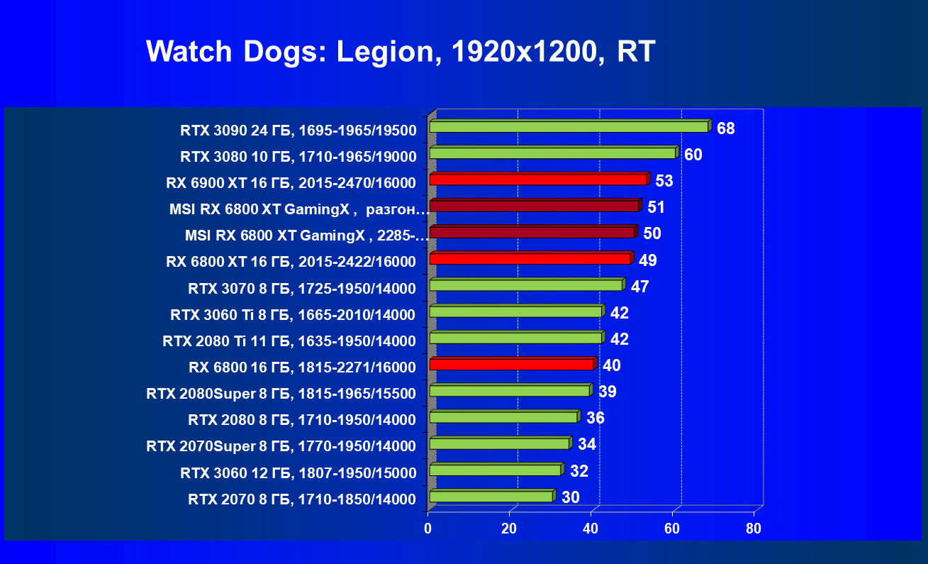 Nvidia GeForce RTX 3080 и AMD Radeon RX 6800 XT являются прямыми соперниками, они демонстрируют почти равную производительность, позволяющую комфортно играть в 4К при максимальных настройках графики, но только в игры без использования трассировки лучей (RT) — при включении трассировки лучей производительность Radeon 6800 XT может упасть до уровня GeForce RTX 3060 Ti. Видеокарта MSI чуть производительнее, чем референсный аналог.