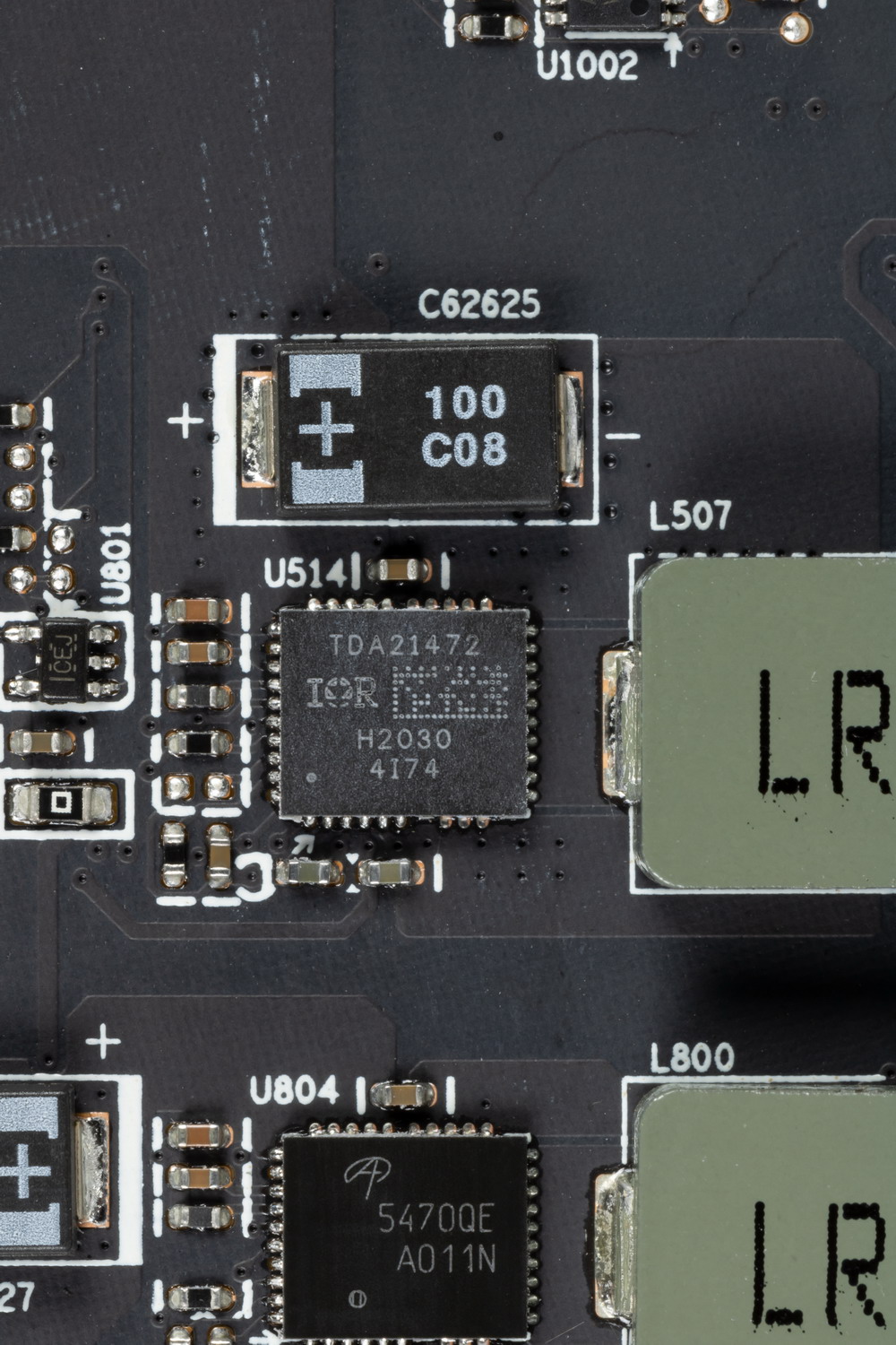 В преобразователе питания GPU, традиционно для всех современных видеокарт, используются транзисторные сборки DrMOS — в данном случае TDA21472 (IR/Infineon).