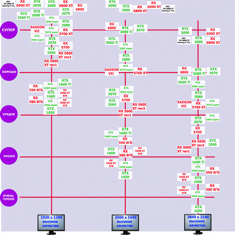 В начале всех обзоров серийных видеокарт мы обновляем свои знания о производительности семейства, к которому относится ускоритель, и его соперников. Все это нами субъективно оценивается по шкале из пяти градаций. Данный обзор был подготовлен до выхода Radeon RX 6700 XT, поэтому последний не представлен на сводных диаграммах.