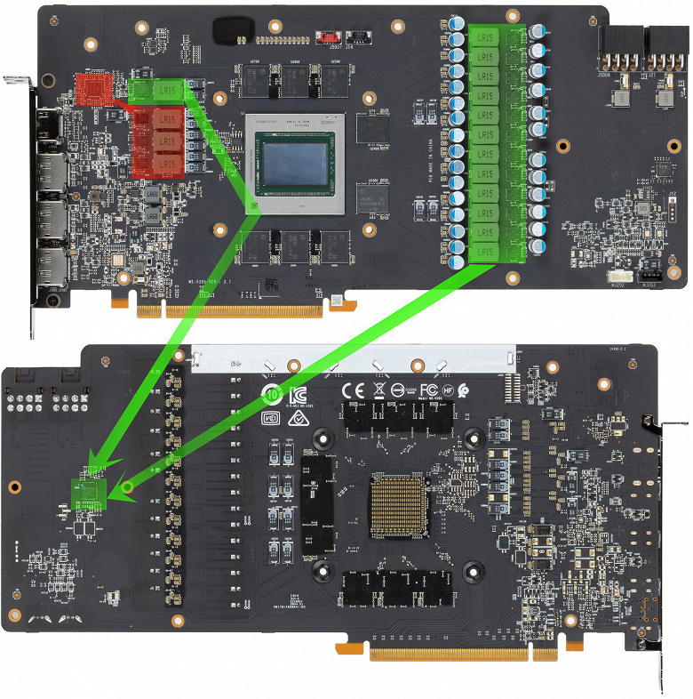 Зеленым цветом отмечена схема питания ядра, красным — памяти. 16-фазный ШИМ-контроллер XDPE132G5D (Infineon) управляет 13 фазами питания GPU (сам контроллер расположен на оборотной стороне PCB).