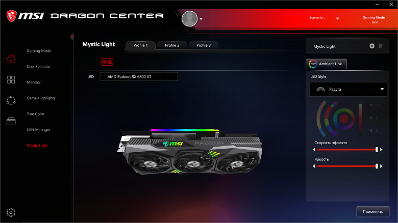 Управление работой карты обеспечивается с помощью хорошо известной фирменной утилиты MSI Dragon Center.