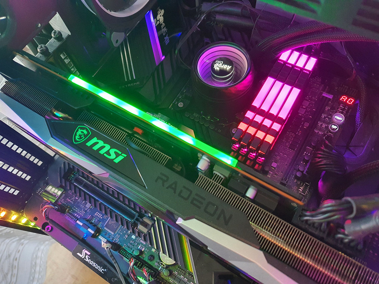 MSI Radeon RX 6800 XT Gaming X Trio 16G (16 ГБ) — прекрасный конкурент флагманским видеокартам на Nvidia GeForce RTX 3080 для игр без трассировки лучей: в целом они почти на одном уровне. Если вынести за скобки GeForce RTX 3090, как изначально полуигровой-полупрофессиональный продукт, то Radeon RX 6800 XT и GeForce RTX 3080 — самые передовые игровые ускорители. Карта MSI имеет приличные размеры из-за кулера, она занимает 3 слота в системном блоке, но зато СО тихая.