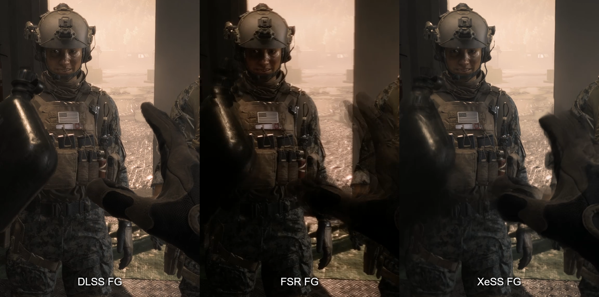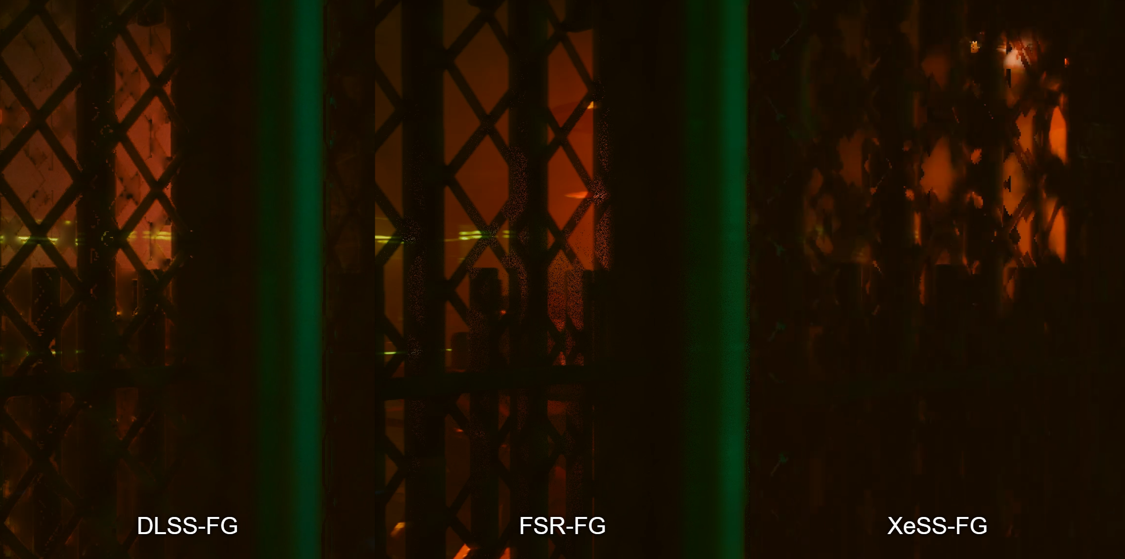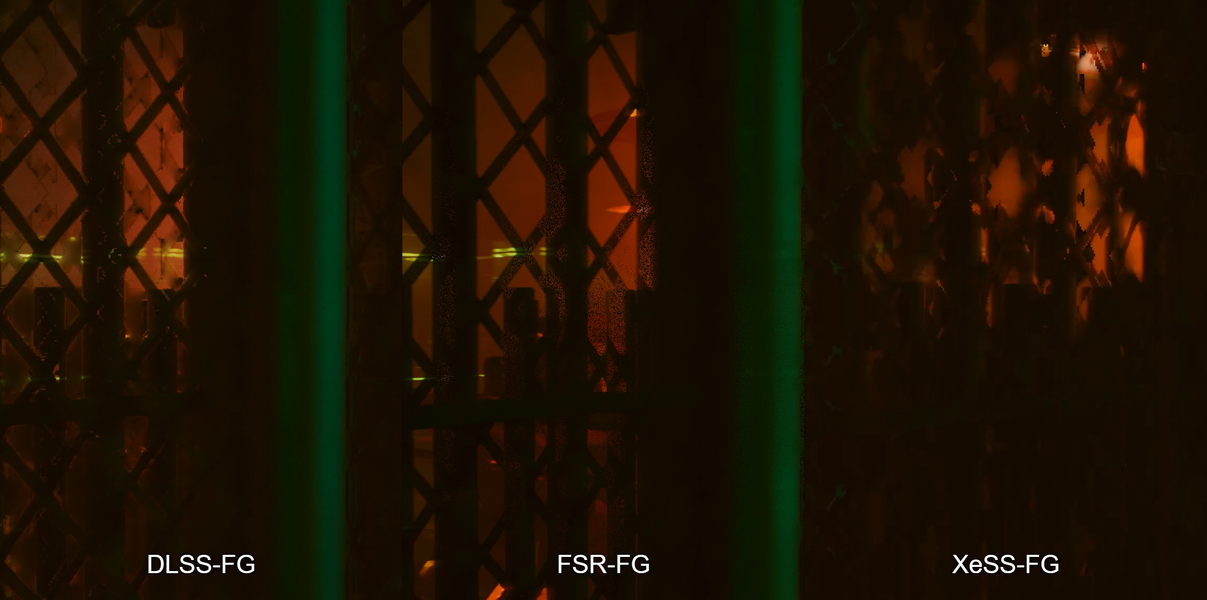 Как видите, удвоение частоты кадров происходит только в середине кадра, а вот генерация DLSS и XeSS работает честнее — по всему кадру. Они вызывают схожие визуальные артефакты, которых просто невозможно было избежать в случае быстро движущейся прямо перед камерой решетки. И всё же, в этом конкретном случае они не такие значительные в решении Nvidia, поэтому именно их технологию можно признать победителем по качеству, как минимум в этой игре. Но посмотрим еще пару стоп-кадров.
