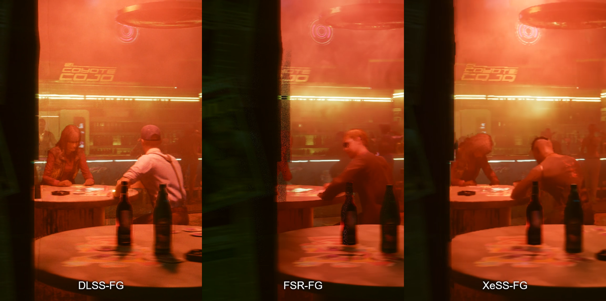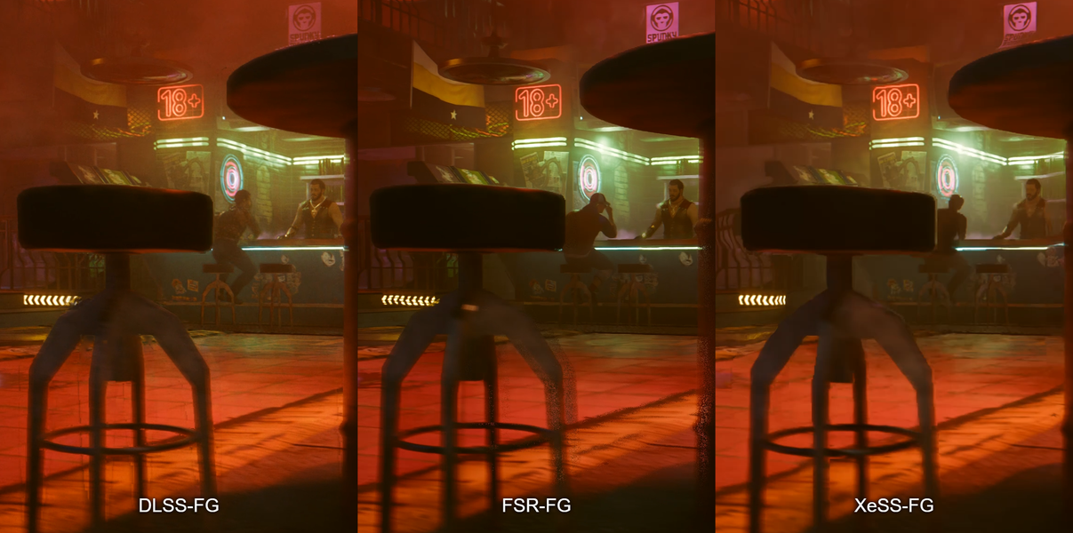 Для FSR ничего не меняется, она работает неплохо, но далеко не по всему полю кадра. А эти перемешанные контрастные пиксели иногда могут вызывать дополнительную потерю плавности восприятия. Что касается DLSS и XeSS, то они снова показали близкие результаты, но если у первой больше артефактов возле бутылок на столе, то у второй — на темной стенке слева и персонаже рядом с ней. В целом, плюс-минус одно и то же для технологий Nvidia и Intel.