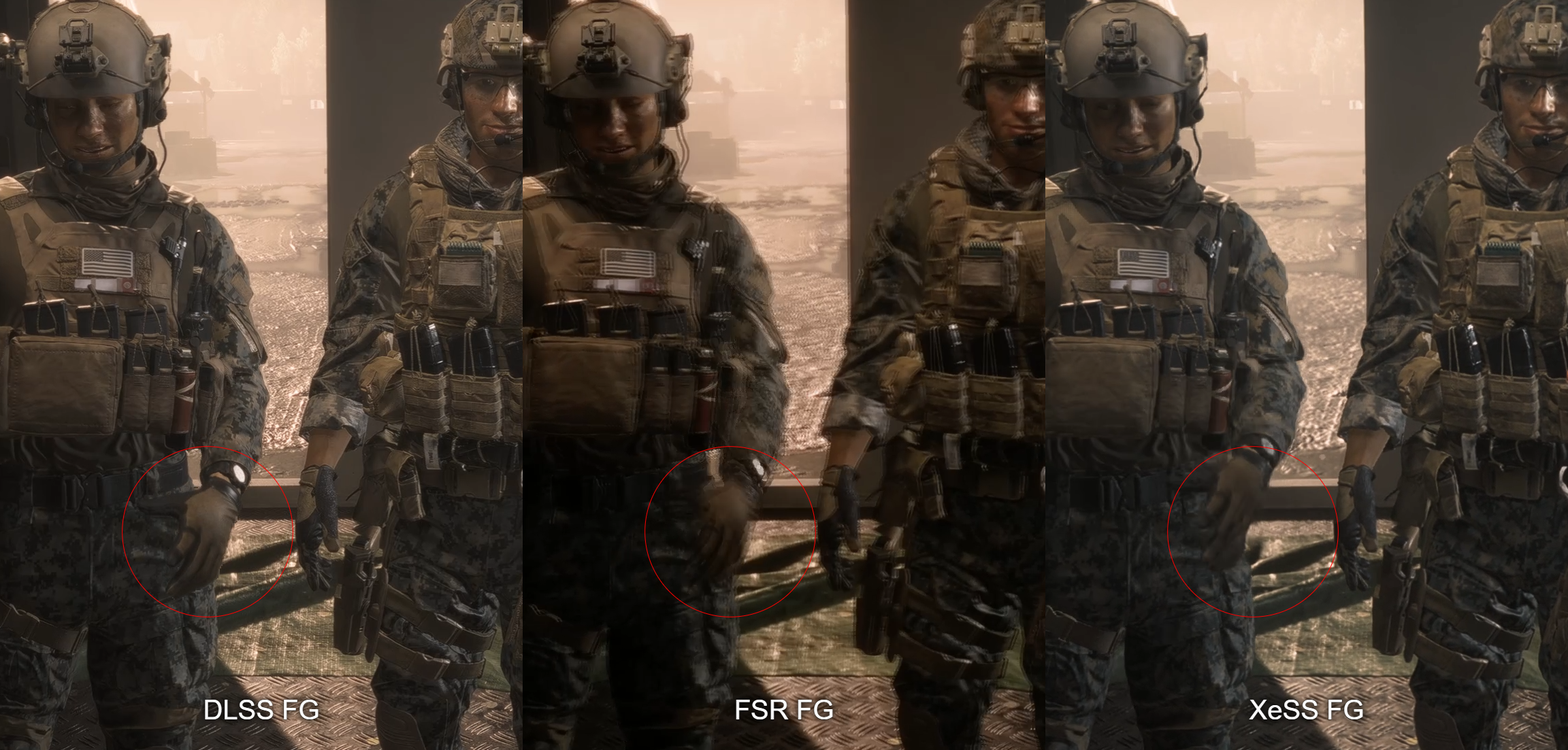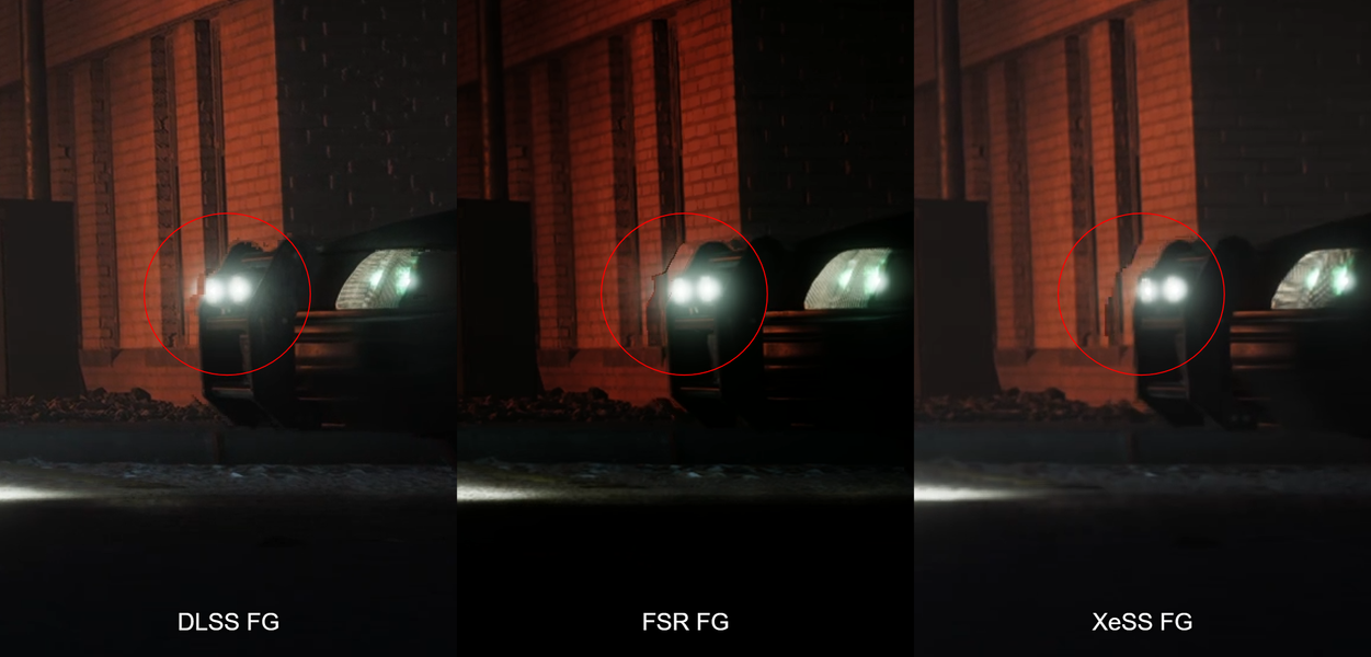 Второй стоп-кадр лишь подтверждает всё написанное выше: FSR тут явно в аутсайдерах, ибо работает точно некорректно, показывая раздвоение по всему полю кадра, XeSS отработал неплохо, но немного сильнее требуемого исказил руку персонажа, выделенную красной окружность. А вот у DLSS дела лучше всех, результат очень четкий и лишь на самой границе движущейся руки есть полоса в 1-2 пикселя, которая интерполирована неидеально — но это сама природа подобных искусственных кадров, иначе просто и быть не может. На меньшую общую четкость XeSS внимания не обращайте, нам иногда приходилось запускать этот метод на Arc B580 в Ultra Performance режиме, чтобы получить достаточную частоту кадров для работы FG — сравнения полностью в одинаковых условиях тут не могло быть в принципе.