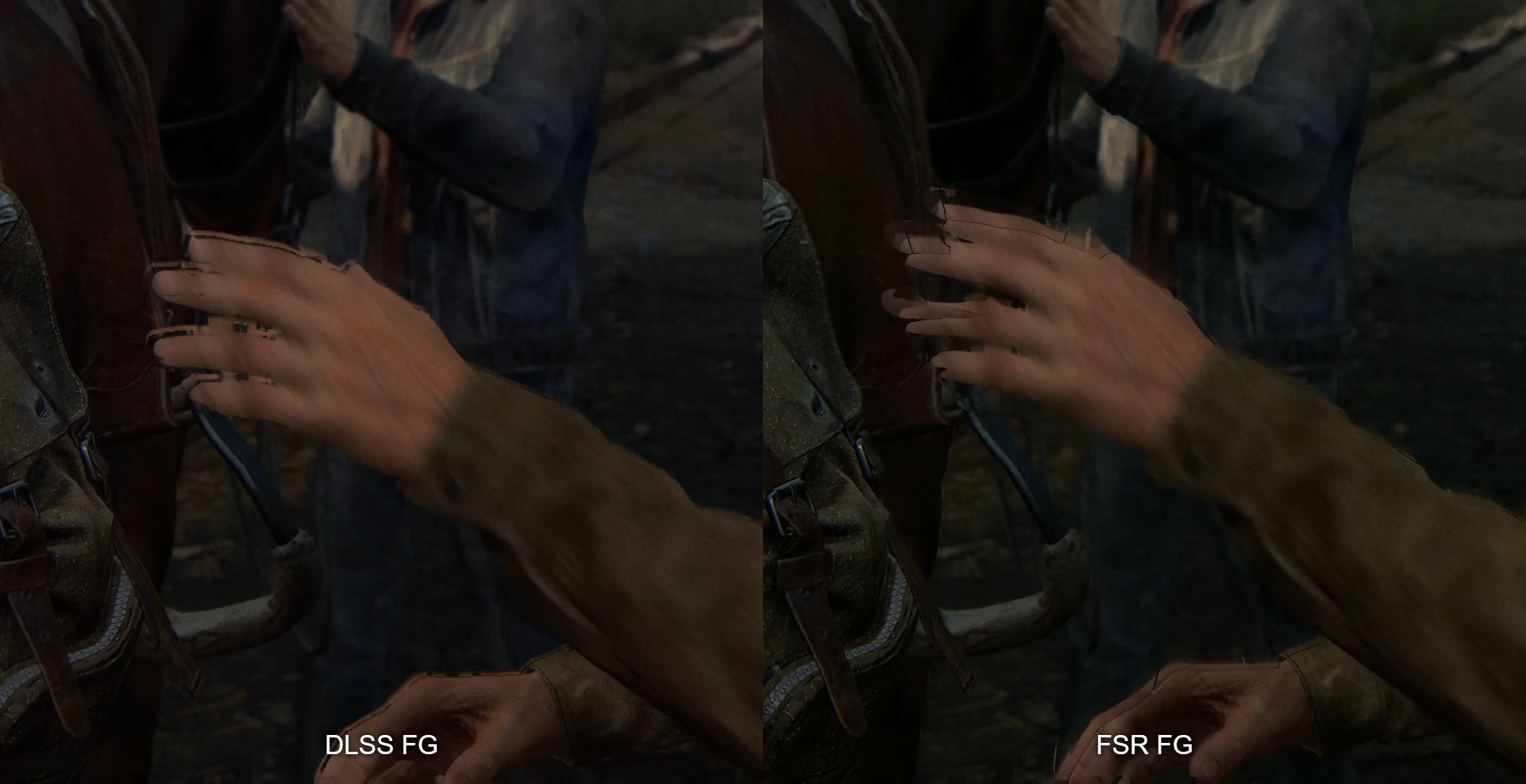 Очевидно, что технологии в этой игре работают схоже, да и результат близкий — вокруг резко движущейся руки появляются явные ореолы, самые привычные артефакты генерации промежуточных кадров. Количество их примерно одинаково для DLSS и FSR, в каких-то кадрах лучше первая технология, в других — вторая, в целом они близки по качеству. Небольшая разница может быть из-за того, что для GeForce и Radeon использовались разные методы масштабирования разрешения, разве что.