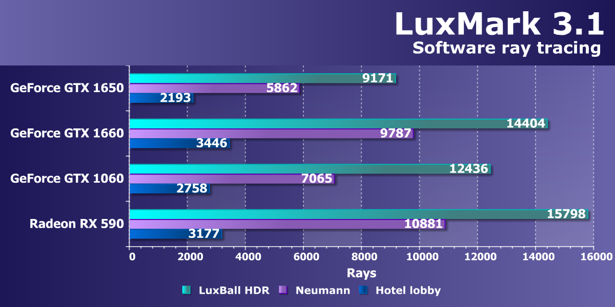 Хотя урезанные по возможностям чипы Turing в виде TU116 и TU117 весьма эффективны именно в текущих играх без использования трассировки лучей, младший чип слишком сильно урезан, чтобы всегда успешно конкурировать с Radeon RX 570, имеющем близкую цену. Многочисленные варианты на основе Polaris из линейки Radeon RX 500 действительно очень сильны. Соперники стараются выставить против GTX 1650 старший вариант Radeon RX 570 с 8 ГБ памяти, и против новинки он выглядит весьма сильно, не говоря уже о наличии вдвое большего объема видеопамяти. А если сравнивать 4-гигабайтные варианты, то RX 570 все равно может выглядеть привлекательнее за счет цены.