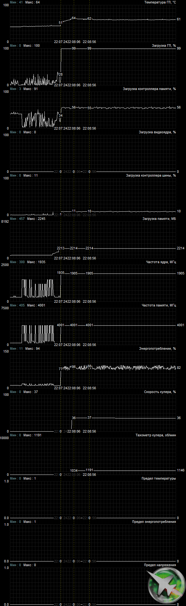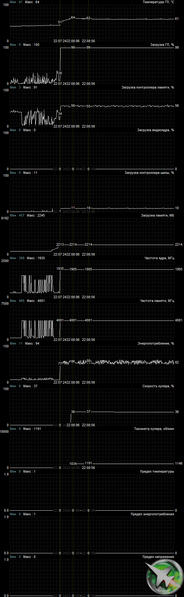 После 6-часового прогона под нагрузкой максимальная температура ядра не превысила 64 градусов, что является отличным результатом для видеокарты такого уровня.