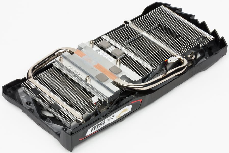 Главной частью системы охлаждения TwinFrozr 7 является довольно большой никелированный радиатор, пронизанный двумя тепловыми трубками. Поверх установлен кожух с двумя вентиляторами Torx 3.0, работающими на одинаковой частоте вращения. Вентиляторы останавливаются в простое и просто при малой нагрузке (при температуре GPU ниже 50-52 градусов). Микросхемы памяти охлаждаются основным радиатором через толстые термопрокладки, а силовых элементов тут кот наплакал, и они вообще не охлаждаются. С оборотной стороны карта ничем не прикрыта.