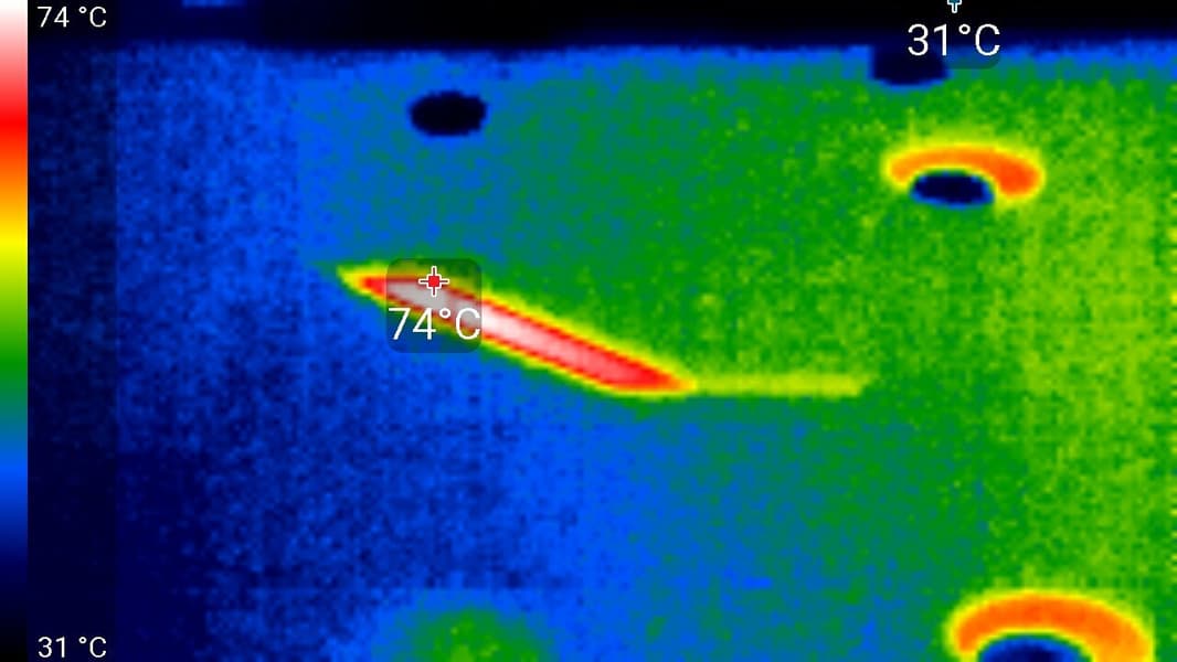 В режиме простоя в 2D температура составляла 44 °C, вентиляторы не работали. Шум был равен фоновому 18,0 дБА.