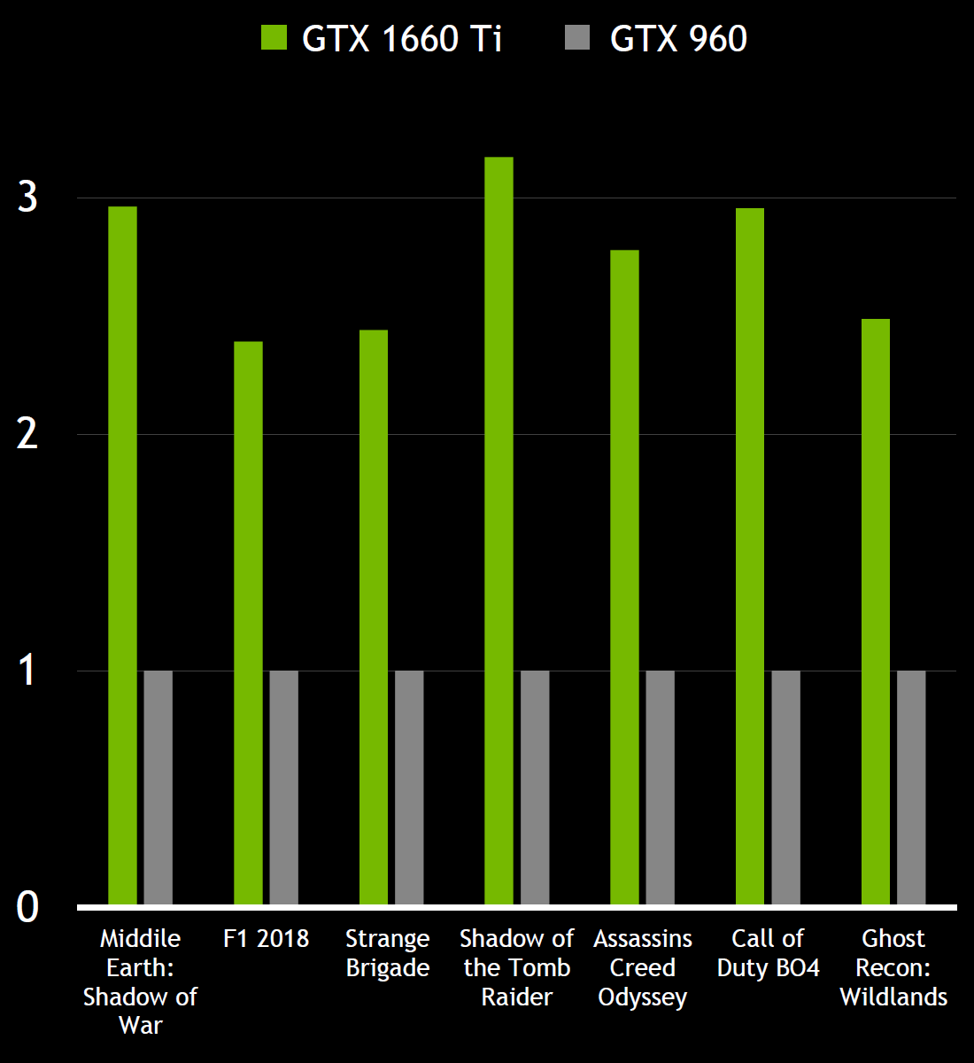 Да и в сверхпопулярных многопользовательских проектах, таких как PUBG, Apex Legends, Fortnite и Call of Duty Black Ops 4, новый GPU позволяет получить 120 FPS и более при высоких настройках качества в Full HD-разрешении. Это довольно важно для динамичных сетевых шутеров, тогда как на видеокартах уровня GeForce GTX 960 игроки получают в тех же условиях лишь 50-60 FPS. А для таких игр высокая частота кадров довольно важна, ведь привычная мерка в 60 FPS в них не является пределом мечтаний — при подключении мониторов с частотой обновления 120-144 Гц удвоенный прирост плавности может принести и повышенную эффективность в сражениях.