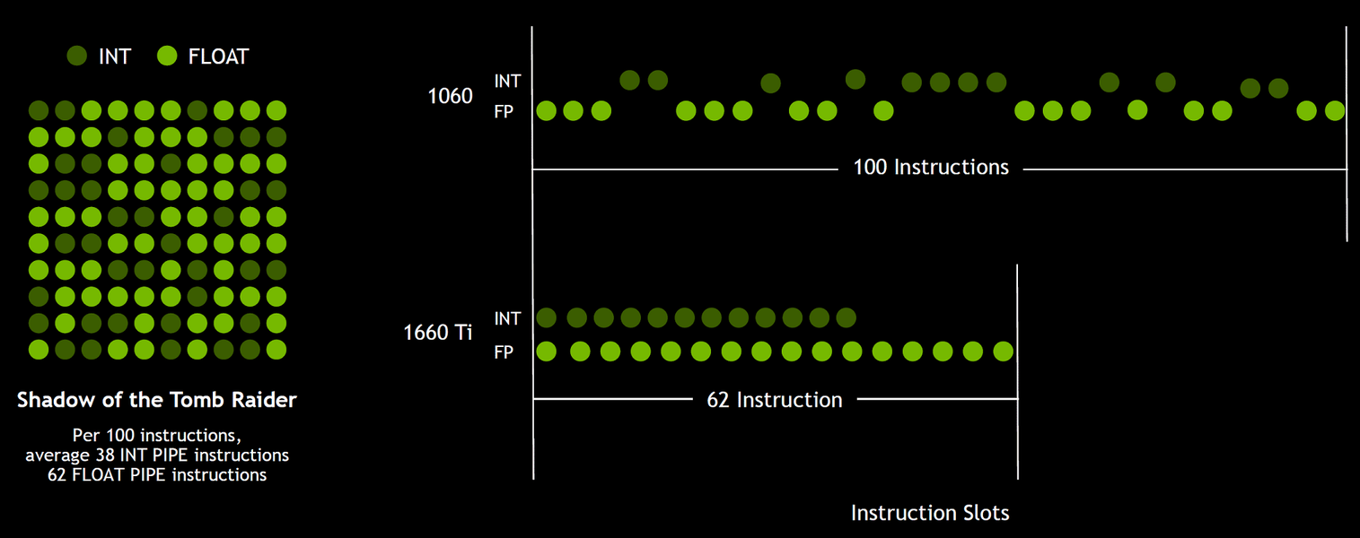 Одновременное исполнение FP- и INT-операций обеспечивает более эффективное исполнение шейдеров, и в сложных случаях прирост получается в полтора раза и более. В частности, общая производительность рендеринга GeForce GTX 1660 Ti в игре Shadow of the Tomb Raider примерно в полтора раза выше, чем у GTX 1060 6GB, хотя это связано не только с указанной модификацией, конечно же.