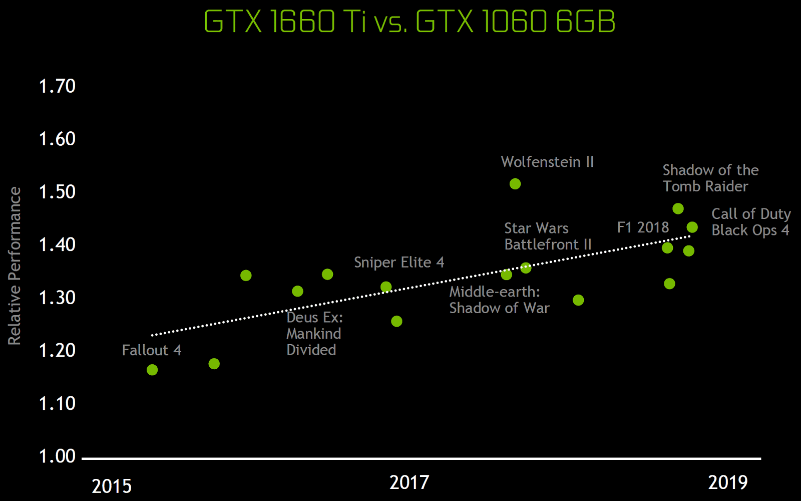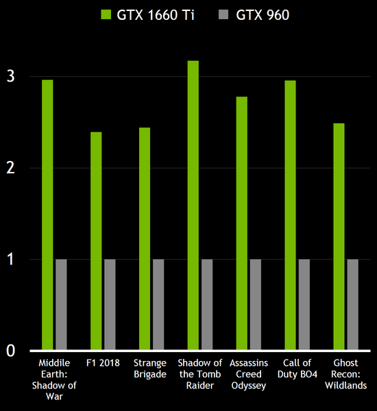 Это и неудивительно, ведь GeForce GTX 1660 Ti обеспечивает в среднем на 40% бо́льшую производительность по сравнению с GTX 1060 6GB, и пусть это не такой уж большой прирост в абсолютных цифрах, но с учетом цены это сейчас самый удачный вариант. Особенно для тех, на кого и целится Nvidia — владельцев видеокарт уровня GTX 960, которые не обновились на Pascal. В этом случае GTX 1660 Ti легко обеспечит им двукратный и более прирост, оказавшись на уровне GTX 1070 из прошлого поколения.