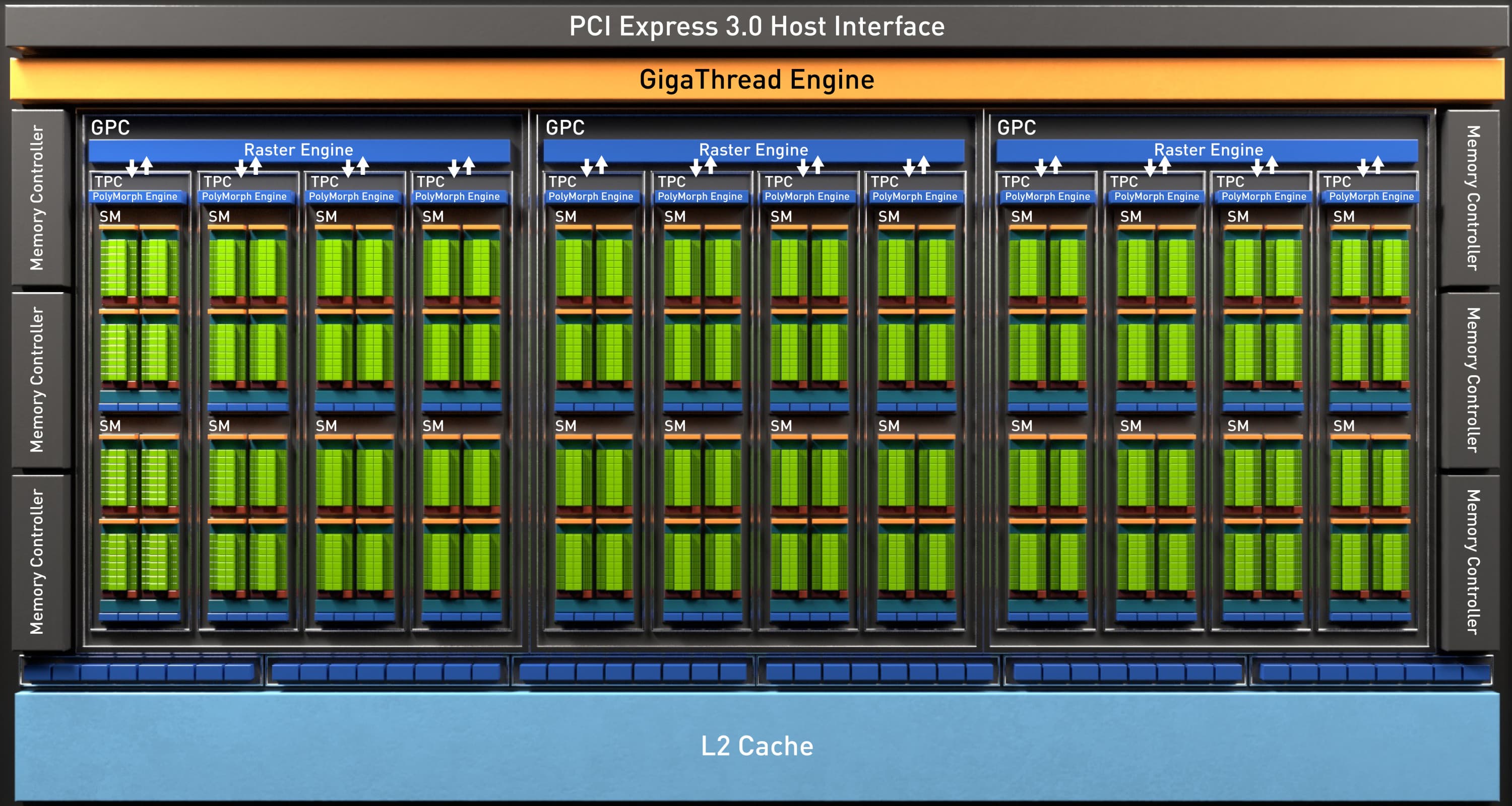 | Блоки текстурирования | 96 блоков текстурной адресации и фильтрации с поддержкой FP16/FP32-компонент и поддержкой трилинейной и анизотропной фильтрации для всех текстурных форматов |