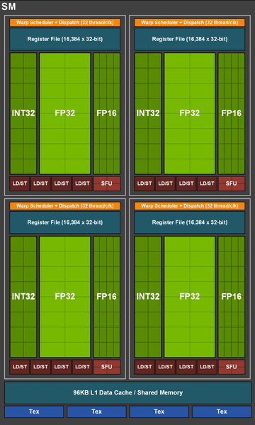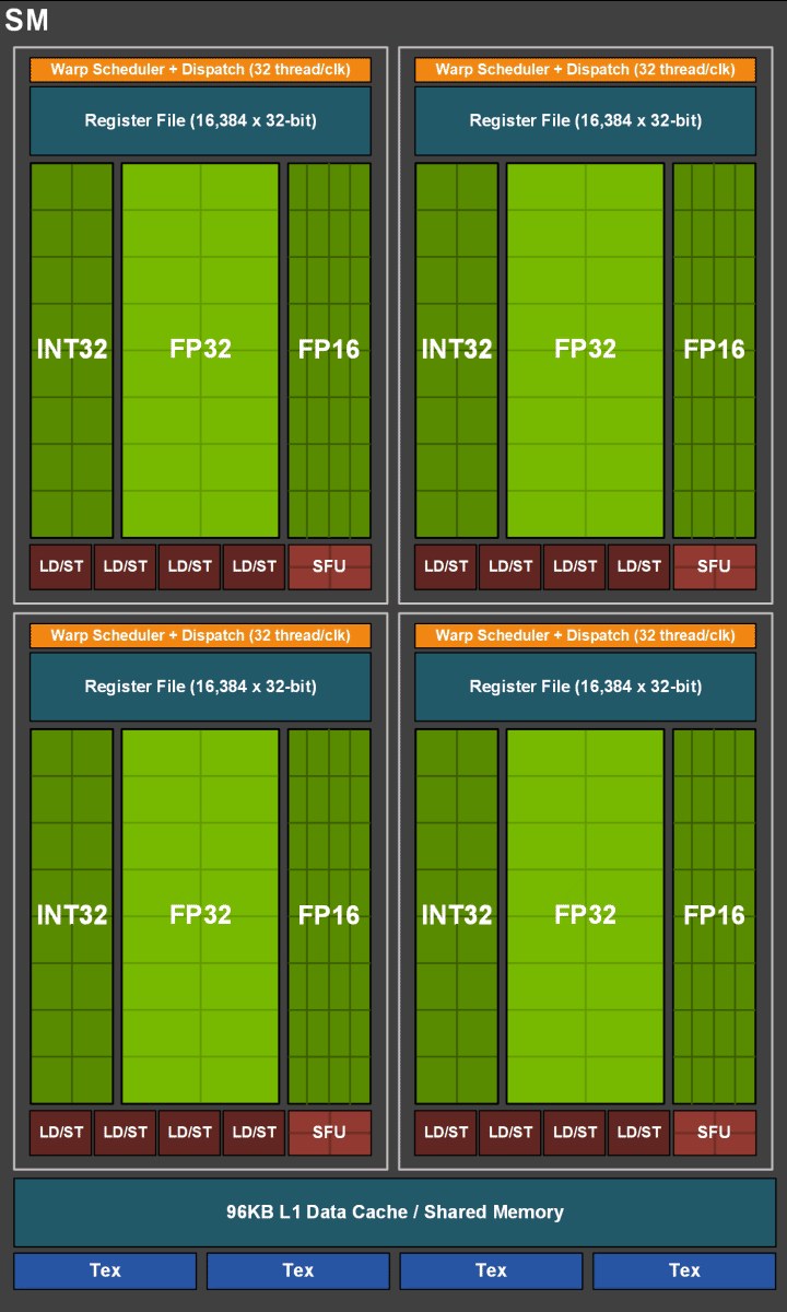 Структура нового дизайна мультипроцессоров SM отличается от того, что было в Pascal. Мультипроцессор Turing разделен на четыре раздела — каждый с собственным блоком планирования и распределения (warp scheduler and dispatch unit), и способен выполнять по 32 потока за такт. В разделах есть несколько типов исполнительных блоков: 16 ядер FP32, 16 ядер INT32 и 32 ядра для исполнения операций с FP16 точностью. Самое важное отличие заключается в том, что обработкой целочисленных операций и операций с плавающей запятой теперь занимаются разные блоки, а операции со сниженной точностью FP16 выполняются вдвое быстрее, чем FP32.