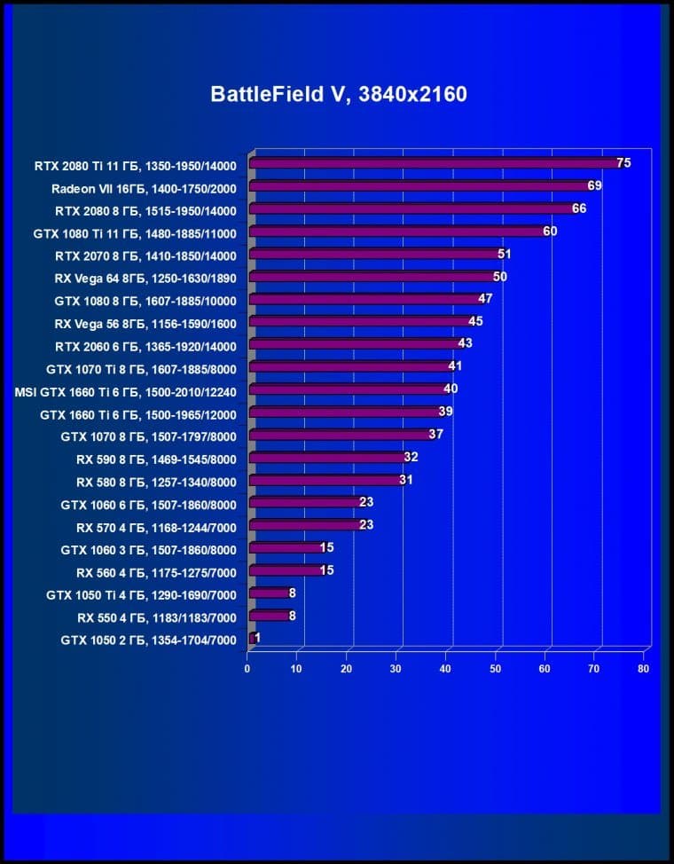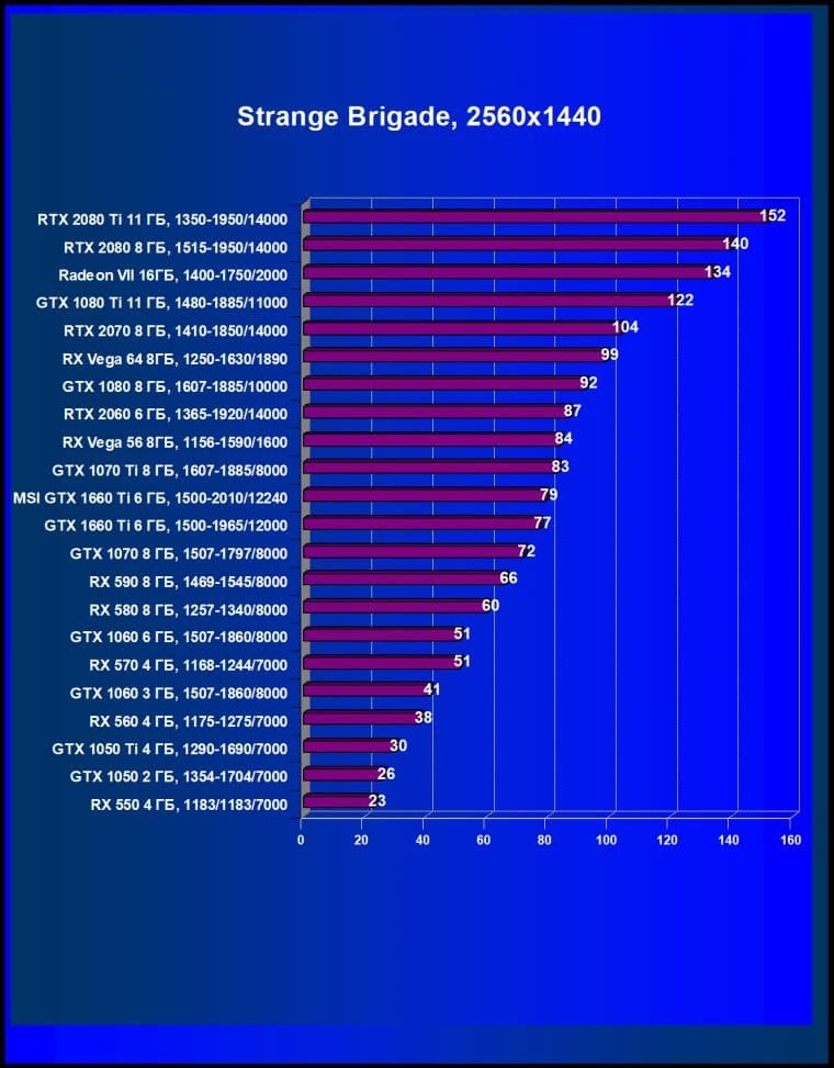 Nvidia GeForce GTX 1660 Ti — удачное проникновение Turing в самый массовый сегмент игрового рынка. Будучи немного медленнее, чем GeForce RTX 2060, но составляя прямую конкуренцию Radeon RX Vega 56 и уходящему с рынка GeForce GTX 1070 (заметим, что про GeForce GTX 1060 речи вообще не идет, новинка гораздо быстрее!), GeForce GTX 1660 Ti обеспечит великолепную производительность в разрешении Full HD с максимальным настройками графики в играх. А иногда можно будет неплохо поиграть и в разрешении 2560×1440. GeForce GTX 1660 Ti демонстрирует великолепный прирост производительности относительно своего формального предка GeForce GTX 1060 (на десятки процентов, иногда и в 2 раза), прилично обходит GeForce GTX 1070 и выходит примерно на уровень конкурента из стана AMD, Radeon RX Vega 56, который, имея более высокую цену, менее выгоден.