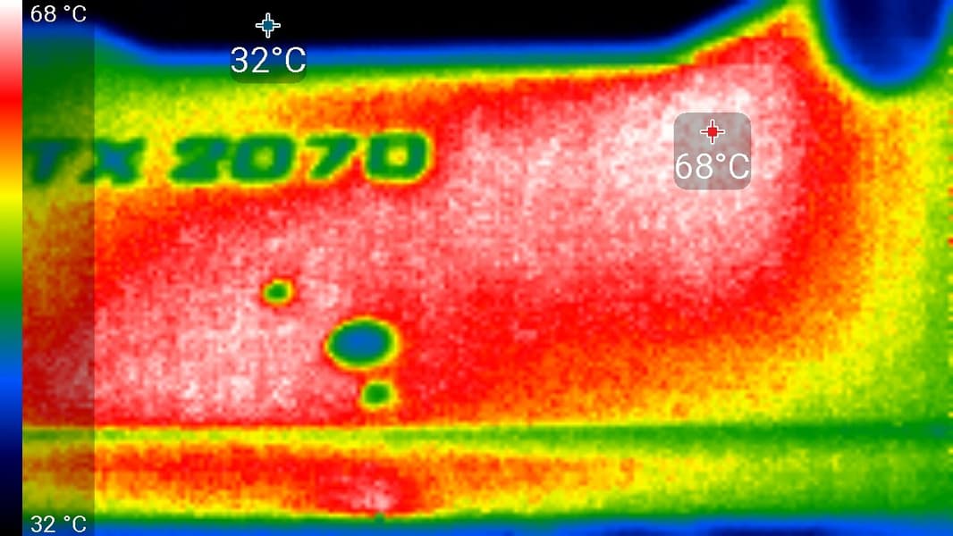 В режиме максимальной нагрузки в 3D температура достигала 72 °C. Вентиляторы при этом раскручивались лишь до 1720-1770 оборотов в минуту, шум вырастал до 31,2 дБА у RTX 2070 Super и до 30,6 дБА у RTX 2060 Super. Так что у обеих карт шум различим, но с ним можно мириться. Еще раз отметим отличную эффективность СО у референс-карт от Nvidia в отличие от... (читатели догадаются).
