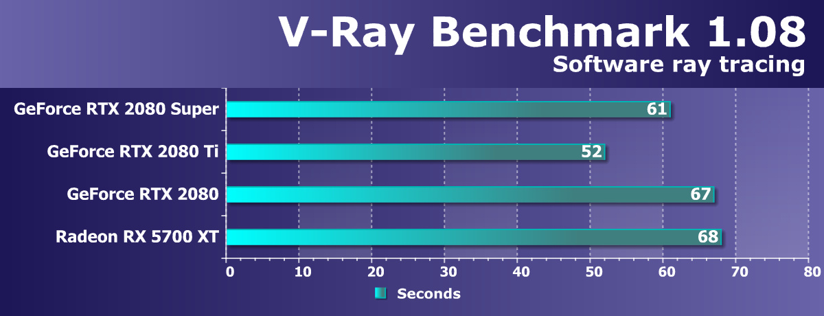 Но даже активация всех блоков и повышение тактовой частоты до 1650 МГц для базовой и 1815 МГц для турбо-частоты (самая высокая в линейке GeForce RTX), соответственно, не привели к существенной прибавке скорости рендеринга, относительно «обычной» модели, и от RTX 2080 Ti новинка осталась все так же весьма далека. Да, ее более чем 11 терафлопс FP32 и 8 гигалучей/с для трассировки лучей — это совсем немало, но не особенно быстрее, чем 10 терафлопс и все те же 8 гигалучей у обычной RTX 2080.