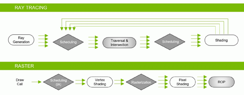 Благодаря семейству GeForce RTX уже сейчас можно использовать трассировку для некоторых эффектов: качественных мягких теней (реализовано в игре Shadow of the Tomb Raider), глобального освещения (ожидается в Metro Exodus и Enlisted), реалистичных отражений (будет в Battlefield V), а также сразу нескольких эффектов одновременно (показано на примерах Assetto Corsa Competizione, Atomic Heart и Control). При этом для GPU, не имеющих аппаратных RT-ядер в своем составе, можно использовать или привычные методы растеризации, или трассировку на вычислительных шейдерах, если это будет не слишком медленно. Вот так по-разному обрабатывают трассировку лучей архитектуры Pascal и Turing: