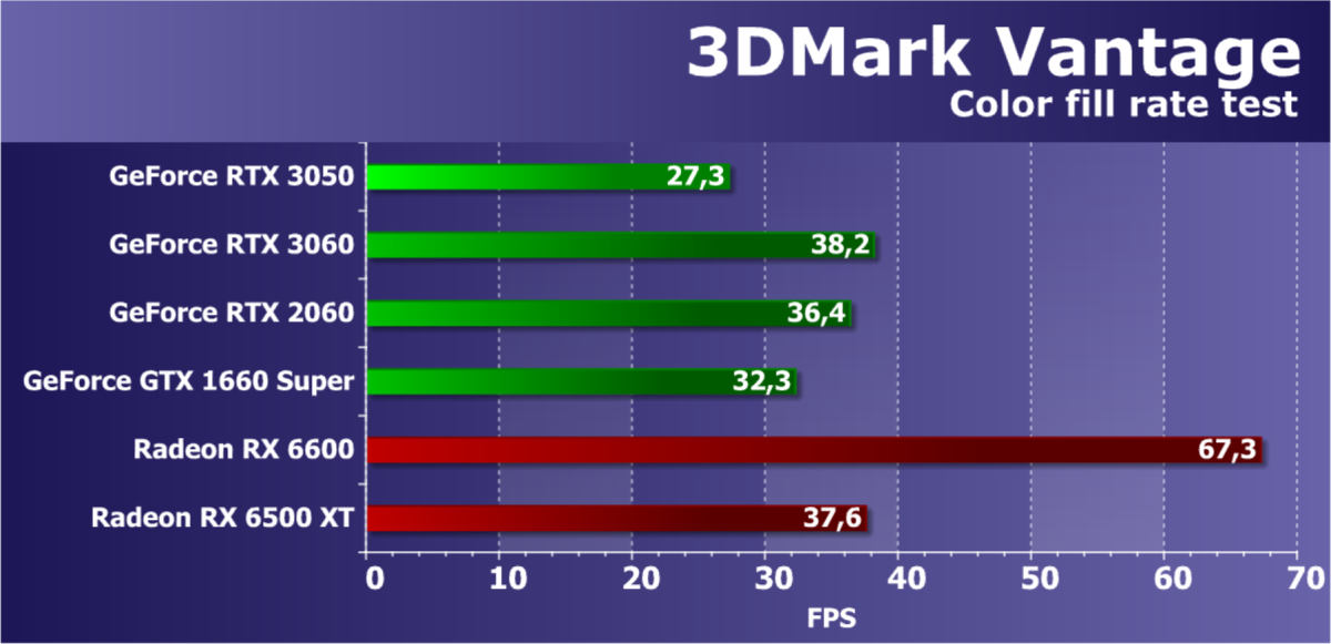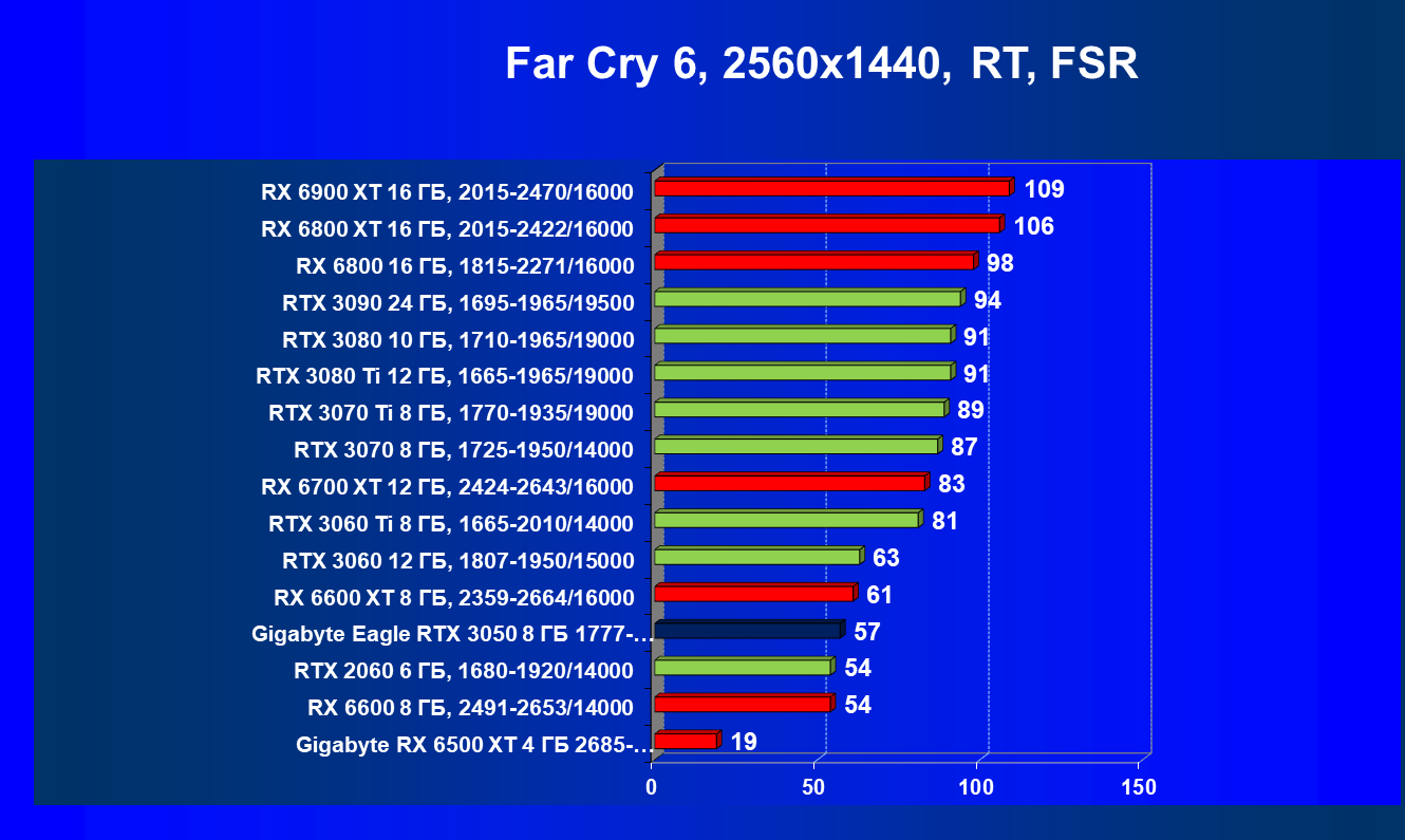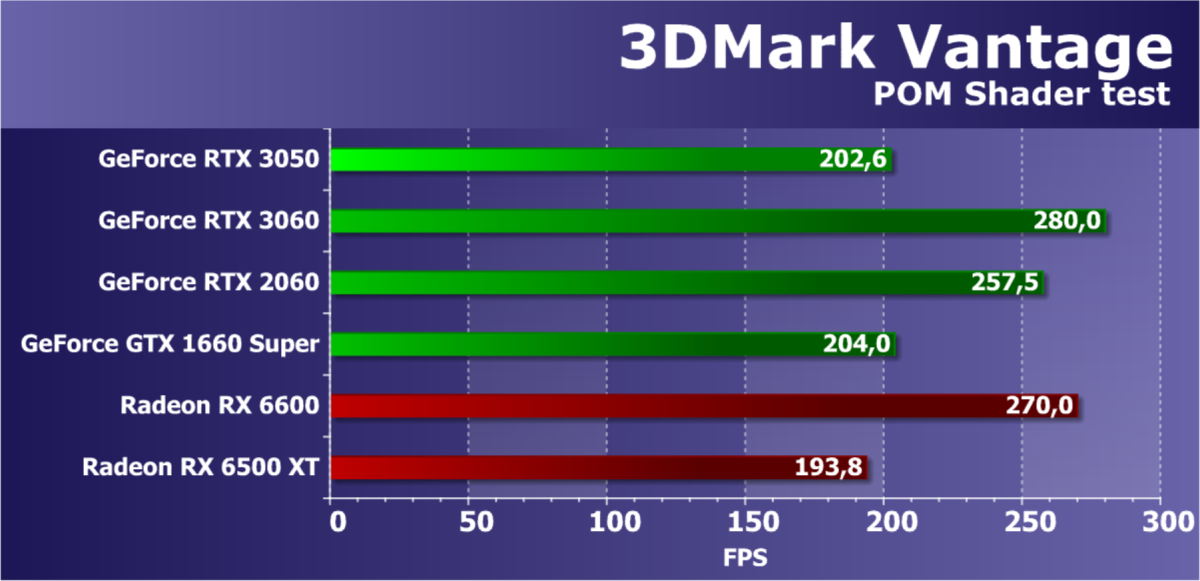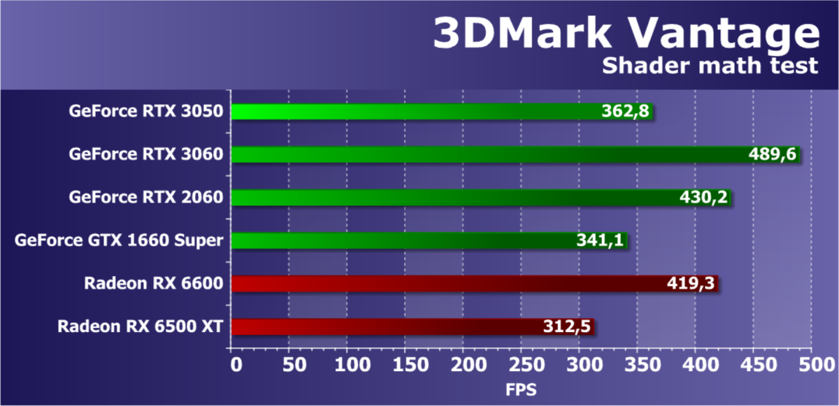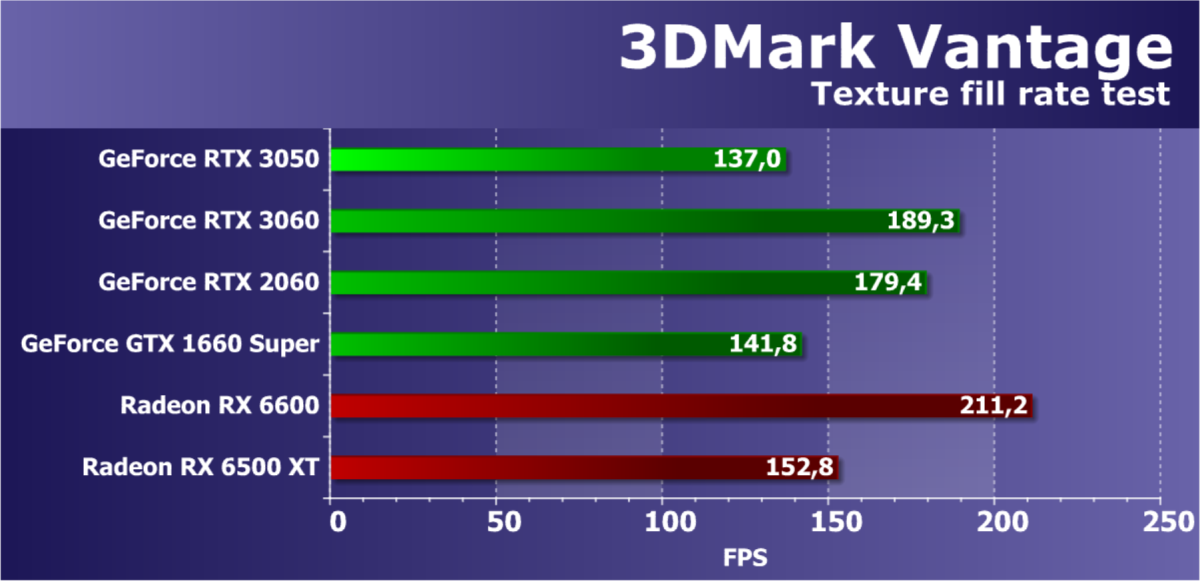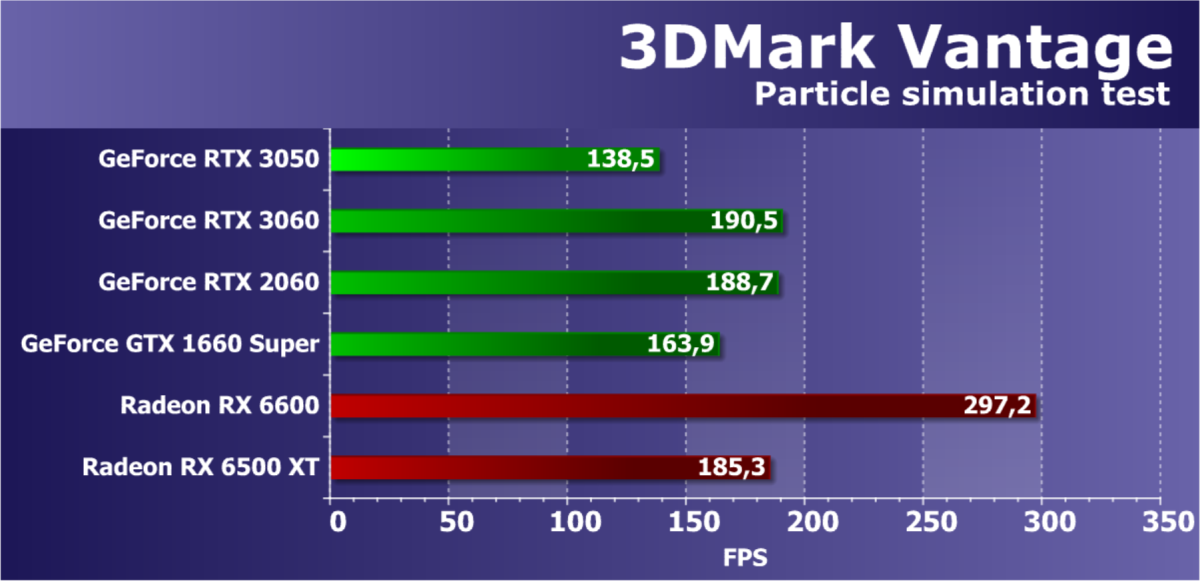 Рейтинг фиксирует, что GeForce RTX 3050 по производительности соответствует GeForce RTX 2060, а из видеокарт конкурента Radeon RX 6600 быстрее, а Radeon RX 6500 XT значительно медленнее.