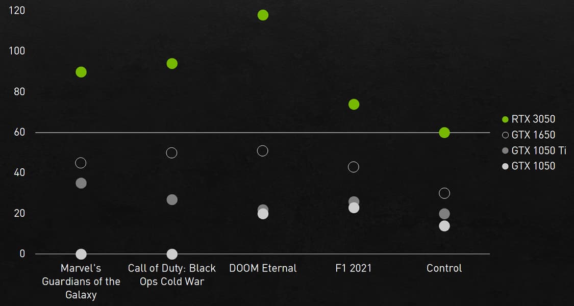 GeForce RTX 3050 содержит 2560 CUDA-ядер, что более чем вдвое больше, чем в GTX 1650, и поэтому новинка обеспечивает гораздо более высокую производительность. Важна также и поддержка других возможностей: разъемов вывода стандарта HDMI 2.1, обеспечивающих вывод в 4K-разрешении при 120 Гц с поддержкой HDR, поддержка декодирования видеороликов формата AV1, обеспечивающего лучшее сочетание коэффициента сжатия и качества картинки по сравнению с привычными H.264, HEVC и VP9.