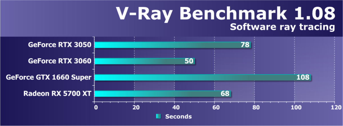 Результаты тестов в «классических» играх (без трассировки лучей) показали, что GeForce RTX 3050 серьезно обходит имеющиеся на рынке младшие видеокарты Nvidia — GeForce GTX 1650 и GTX 1650 Super. Если же сравнивать с ускорителями Nvidia серии RTX, то новинка находится на уровне между GeForce RTX 2060 и GeForce RTX 3060, обычно ближе к первому.