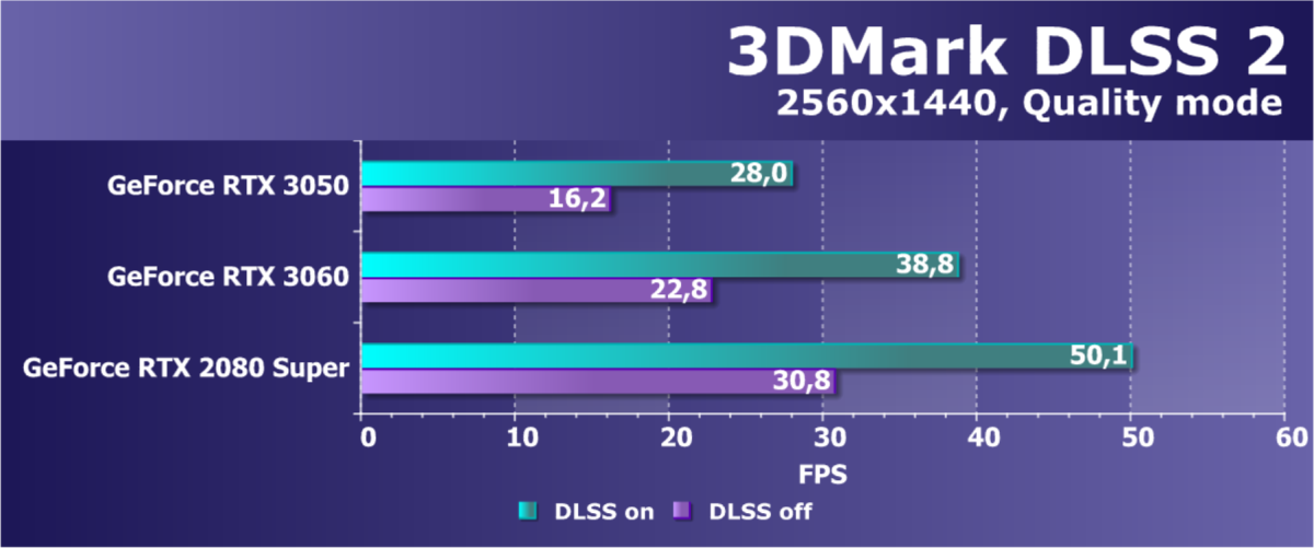 Видеокарта RTX 3050 в схожих условиях в разрешении Full HD обеспечивает уже как минимум 60 FPS, а в некоторых играх и до 100—120 кадров в секунду. В каких-то игровых проектах можно будет даже включить трассировку лучей, но исключительно в связке с масштабированием разрешения DLSS — в указанных выше играх получится 60—90 FPS, что вполне приемлемо и комфортно.