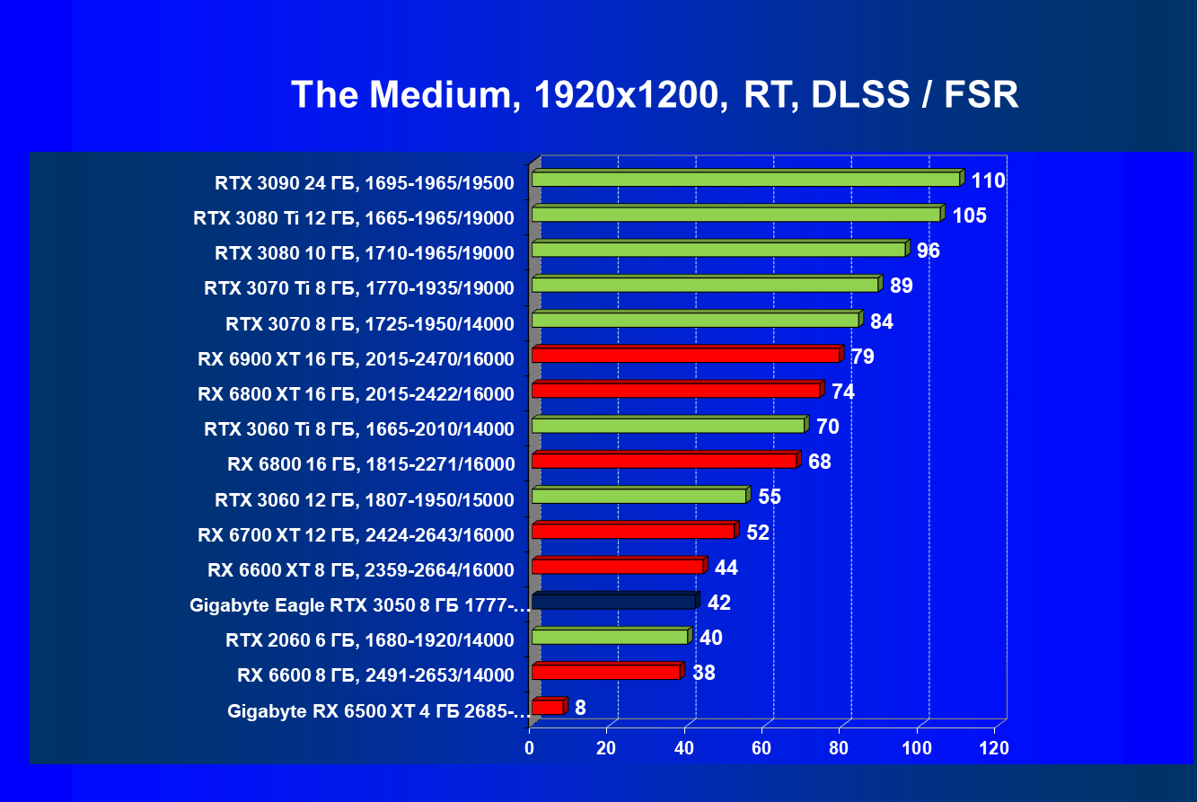 | 01 | Gigabyte Eagle RTX 3050 8 ГБ, 1777—1927/14000 | 106 | 423 | 40 000 |