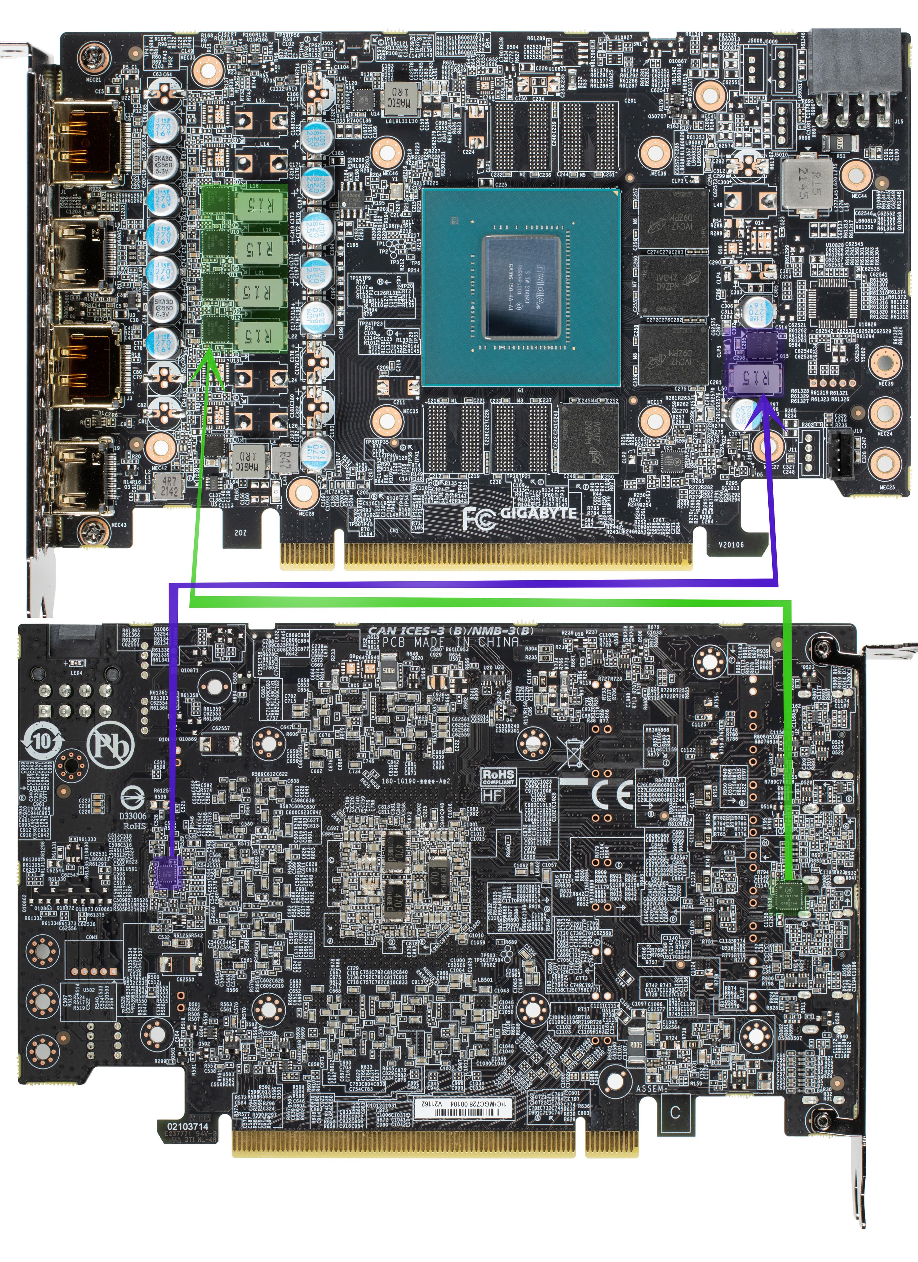 Полная версия графического процессора GA106 содержит 3840 потоковых CUDA-ядер, 30 RT-ядер второго поколения и 120 тензорных ядер третьего поколения. Подсистема памяти нового GPU включает шесть 32-битных контроллеров памяти, что дает 192-бит в целом.