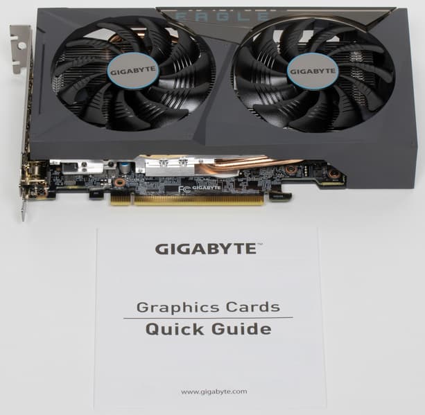 Комплект у Gigabyte Eagle RTX 3050 8 ГБ обыкновенный: краткая инструкция и сама карта.