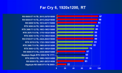 Рейтинг составлен по 6 тестам с применением технологии трассировки лучей. На сегодня RT поддерживается ускорителями серий Nvidia GeForce RTX и AMD Radeon RX 6000. Этот рейтинг нормирован по Radeon 6500 XT (то есть сочетание скорости и функций Radeon 6500 XT приняты за 100%).