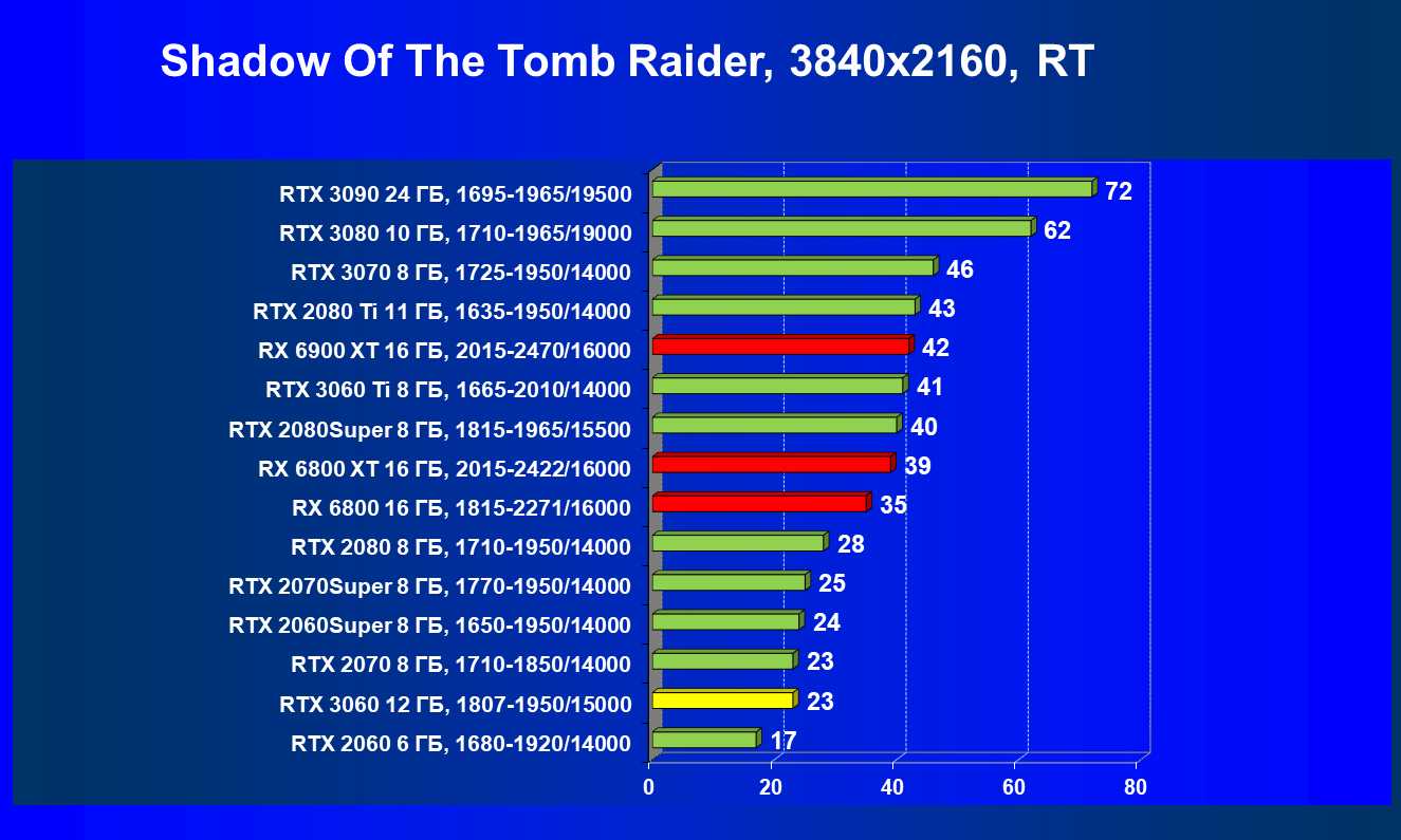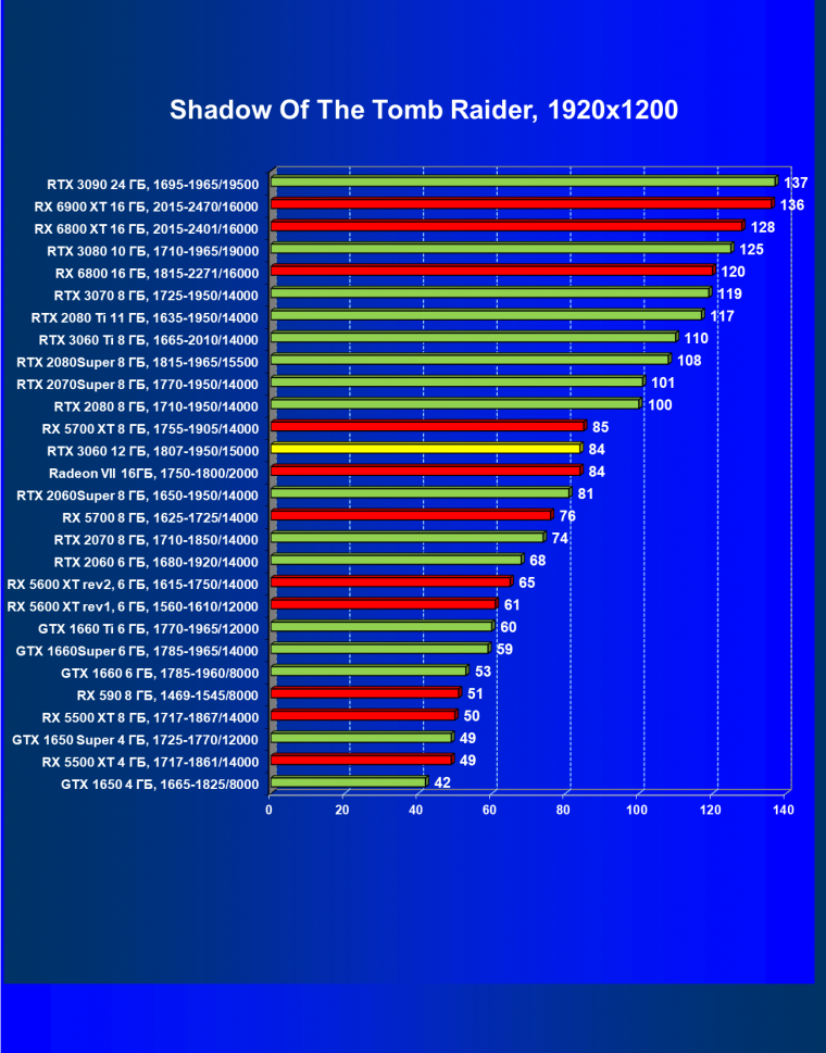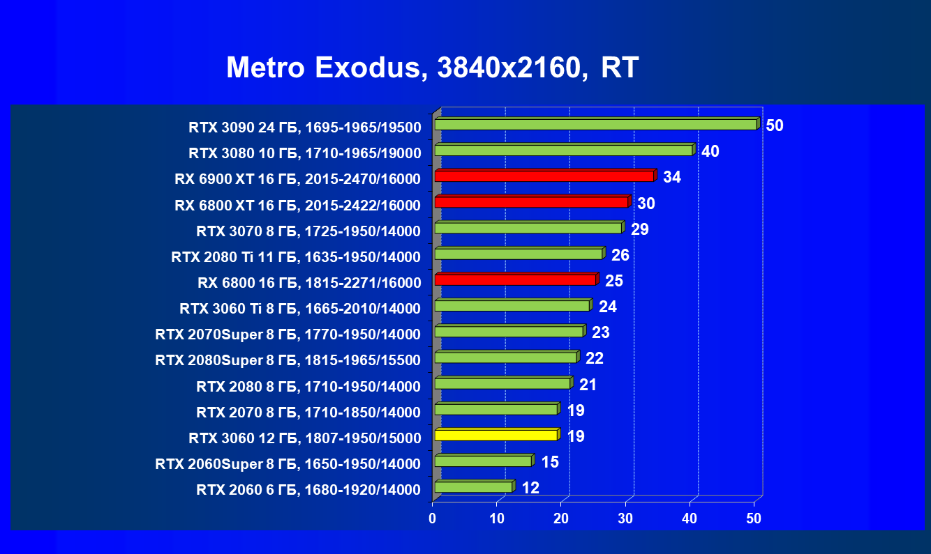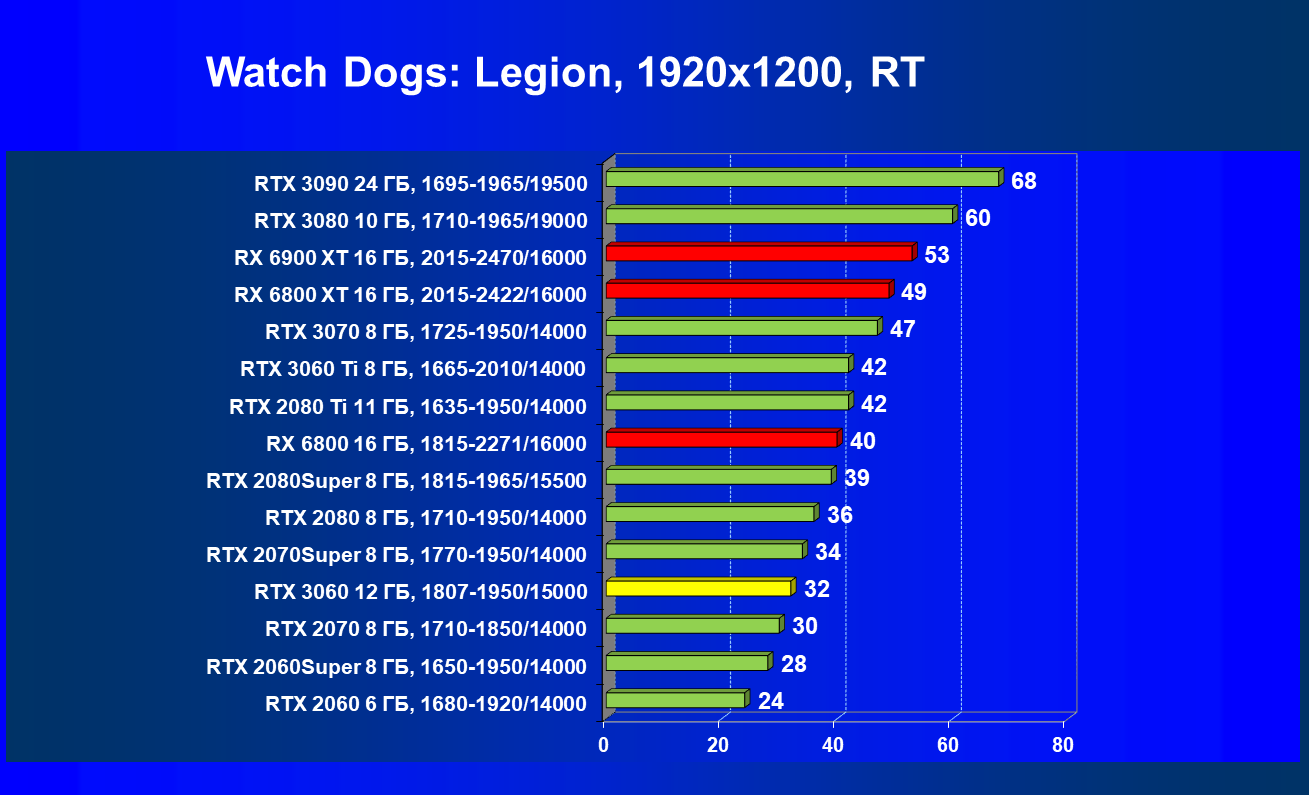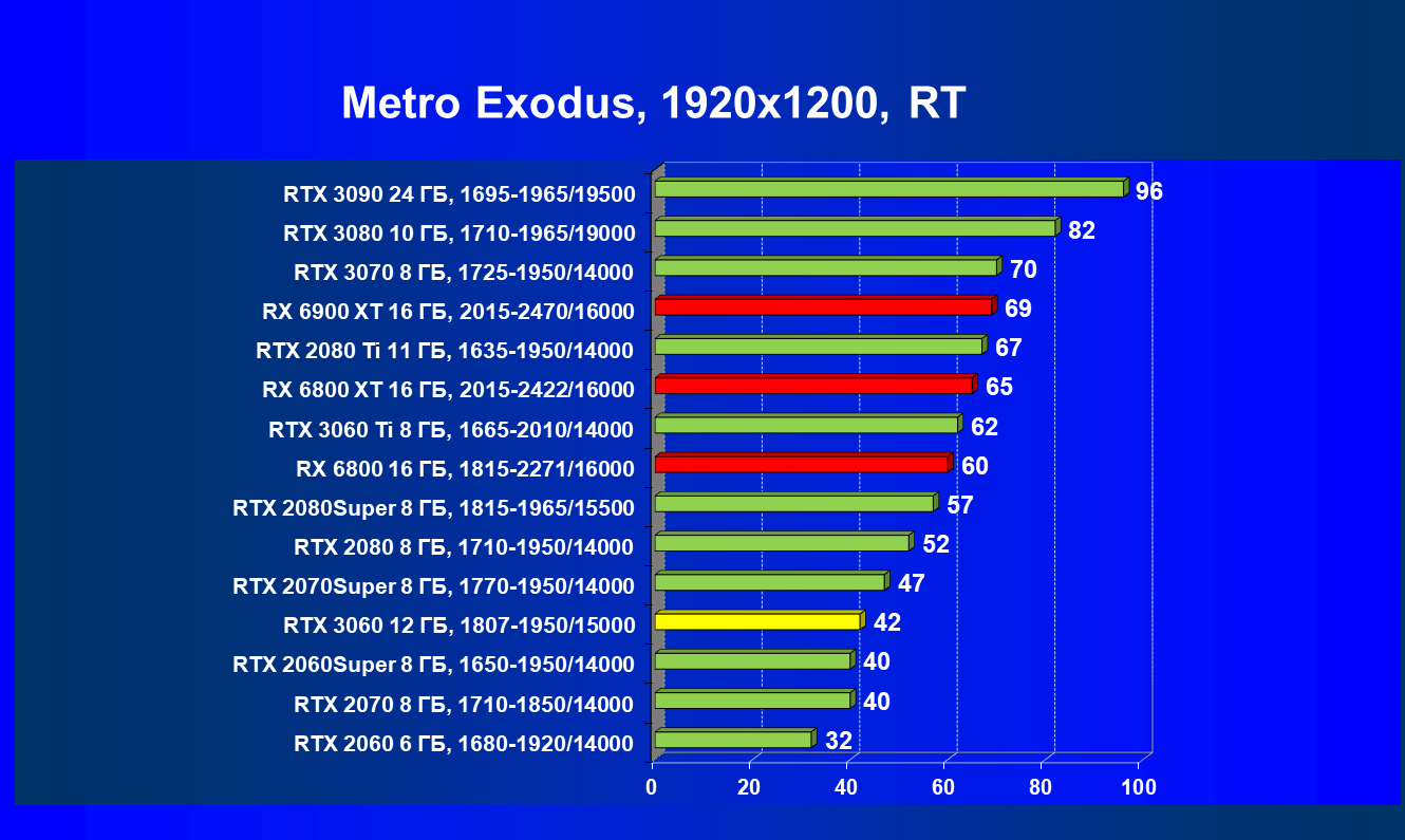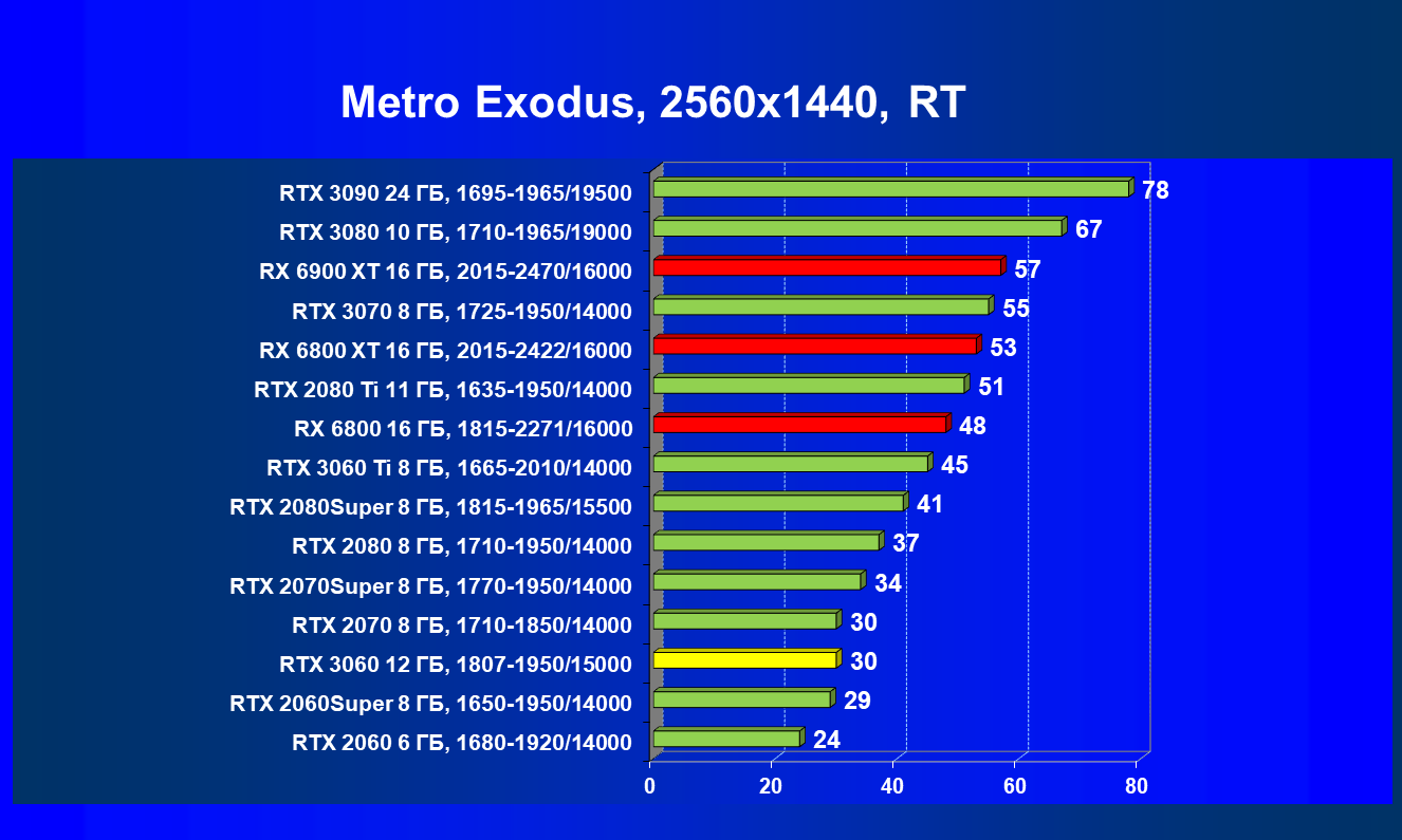 Видеокарты AMD до Radeon RX 6000 здесь по очевидным причинам отсутствуют, а в этом семействе достаточно дешевой (сегодня это слово звучит издевательски по отношению к видеокартам) модели для конкуренции с GeForce RTX 3060 нет. Сравнение с Radeon RX 6800 показало, что несмотря на драматическое падение скорости у этого ускорителя в играх с трассировкой лучей, Radeon RX 6800 все-таки не опускается ниже уровня GeForce RTX 3070. GeForce RTX 3060 здесь полностью повторяет производительность более старшей модели из предыдущего поколения — GeForce RTX 2070 (и немного опережает GeForce RTX 2060 Super).