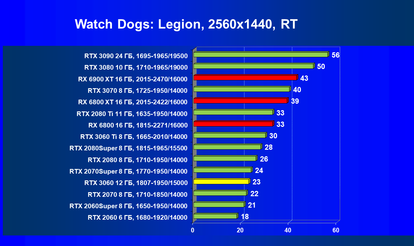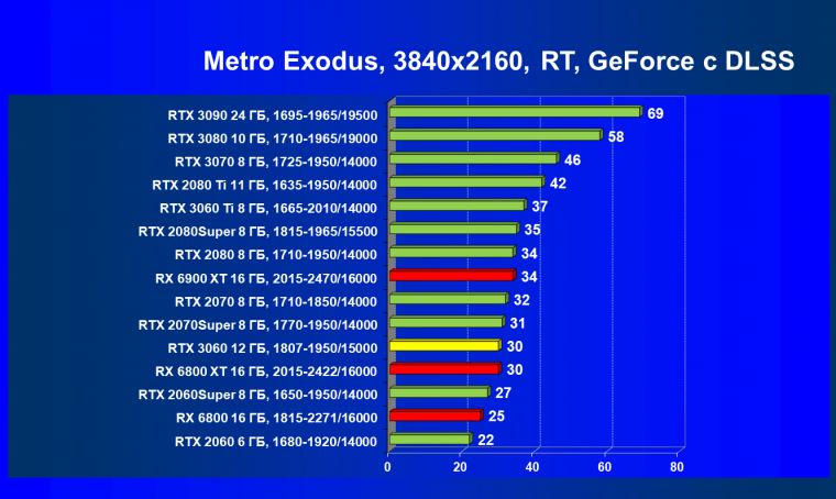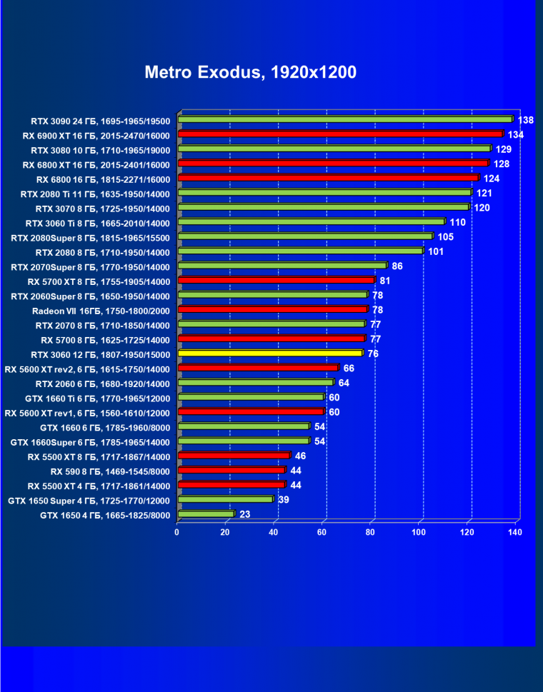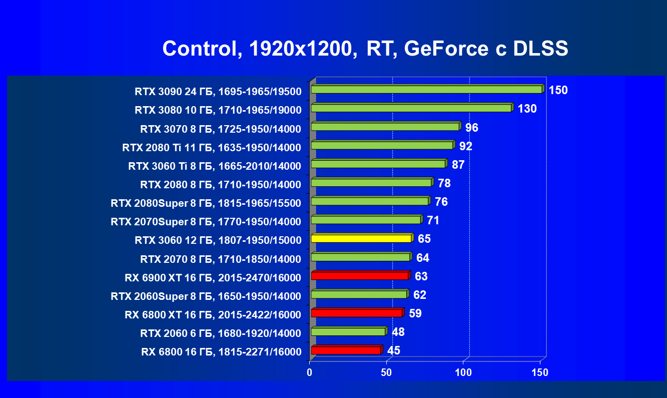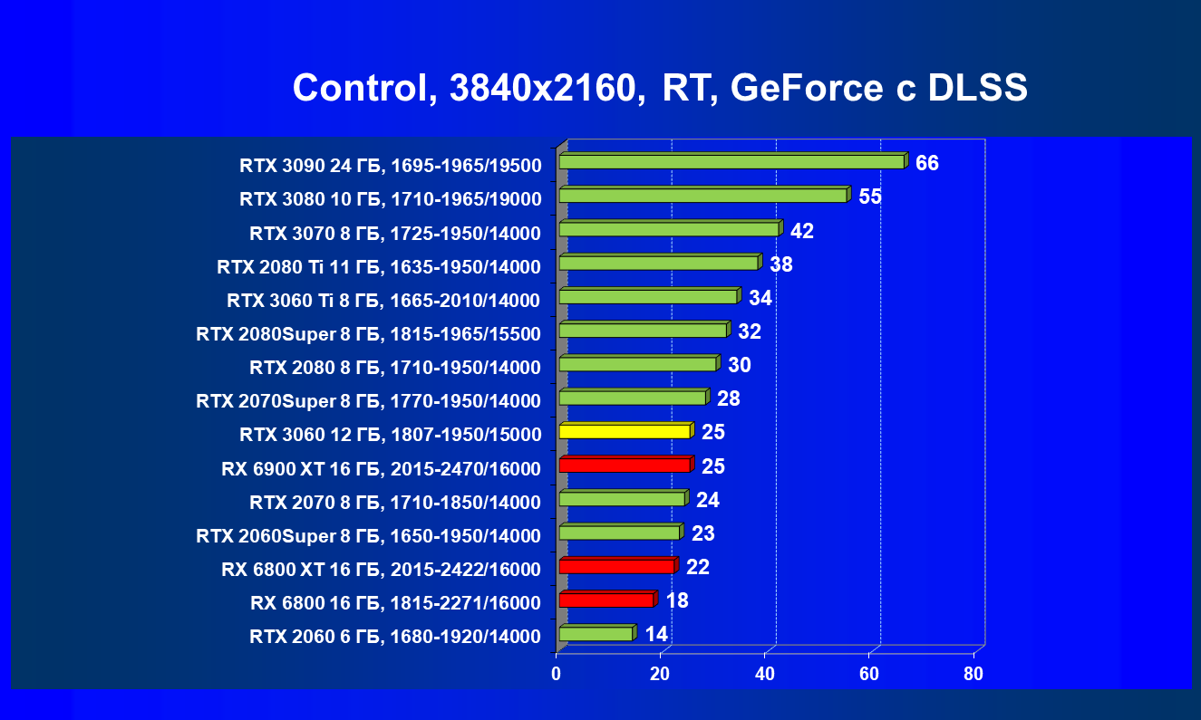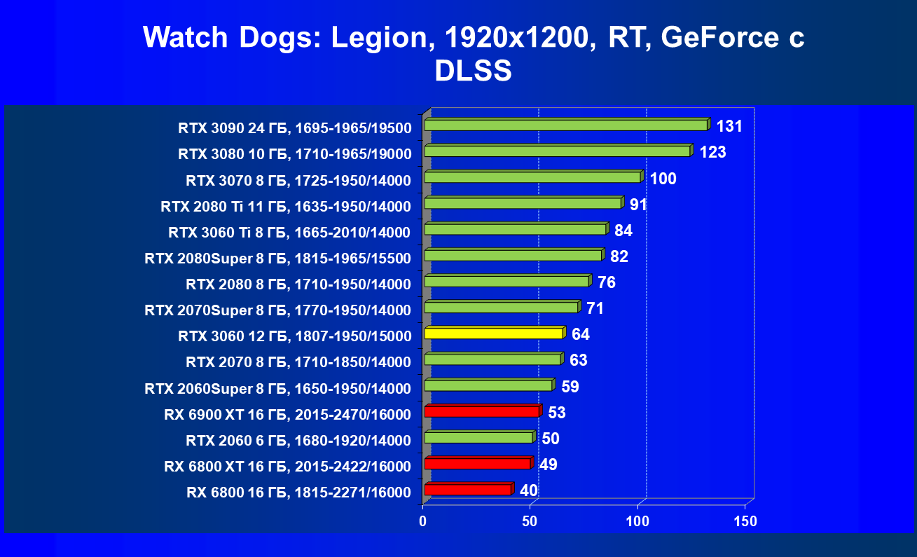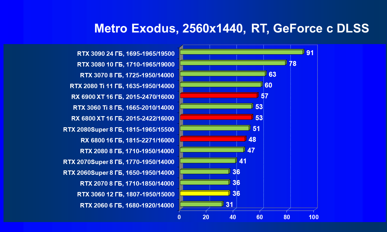 Видеокарты AMD до Radeon RX 6000 здесь по очевидным причинам отсутствуют, а в этом семействе достаточно дешевой (сегодня это слово звучит издевательски по отношению к видеокартам) модели для конкуренции с GeForce RTX 3060 нет. Сравнение с Radeon RX 6800 показало, что несмотря на драматическое падение скорости у этого ускорителя в играх с трассировкой лучей, Radeon RX 6800 все-таки не опускается ниже уровня GeForce RTX 3070. GeForce RTX 3060 здесь полностью повторяет производительность более старшей модели из предыдущего поколения — GeForce RTX 2070 (и немного опережает GeForce RTX 2060 Super).