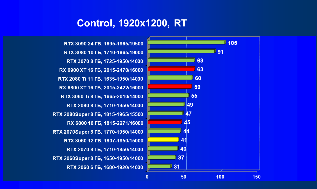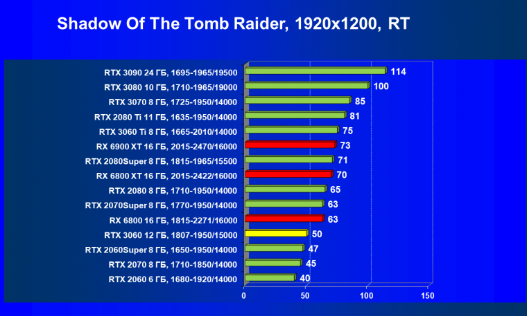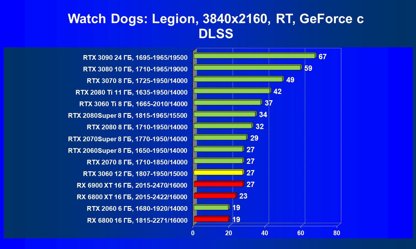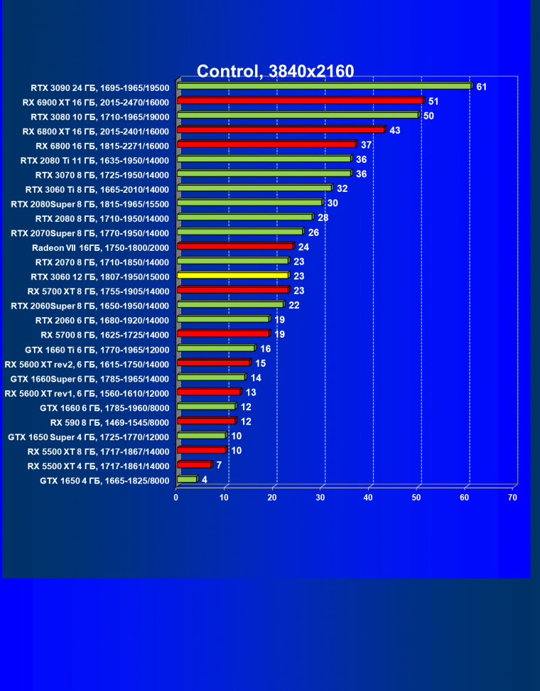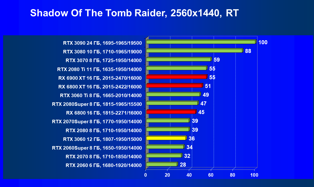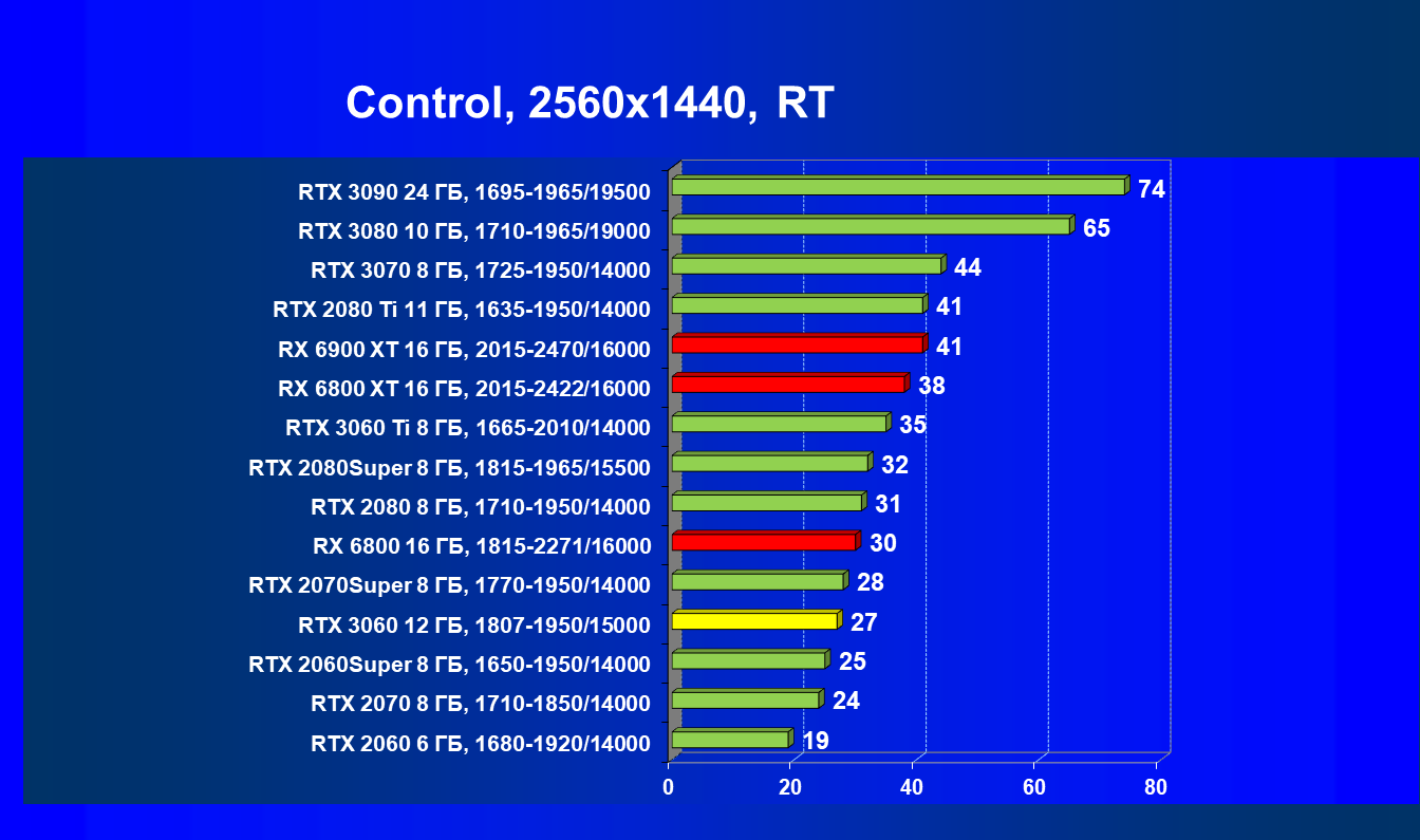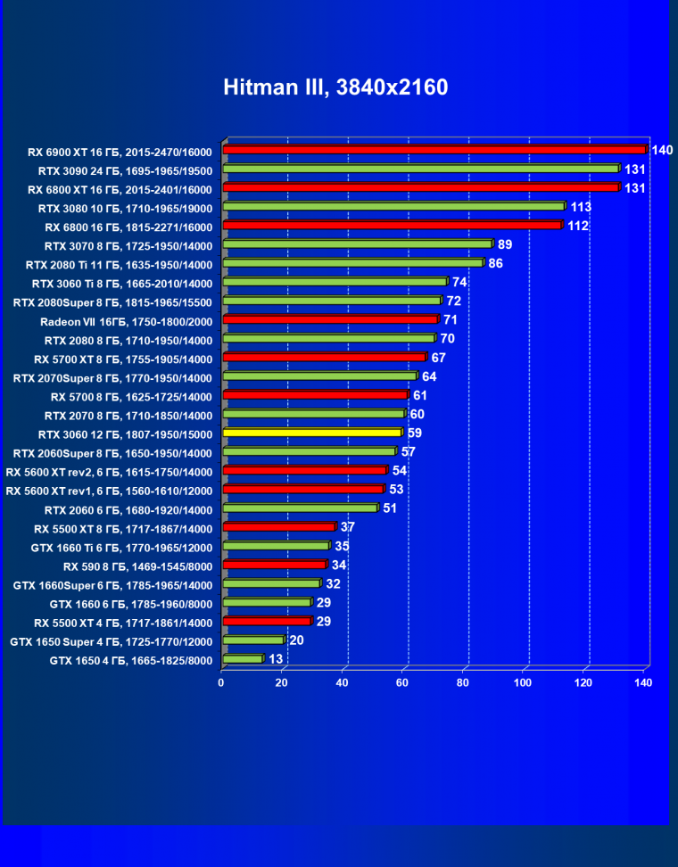 Видеокарты AMD до Radeon RX 6000 здесь по очевидным причинам отсутствуют, а в этом семействе достаточно дешевой (сегодня это слово звучит издевательски по отношению к видеокартам) модели для конкуренции с GeForce RTX 3060 нет. Сравнение с Radeon RX 6800 показало, что несмотря на драматическое падение скорости у этого ускорителя в играх с трассировкой лучей, Radeon RX 6800 все-таки не опускается ниже уровня GeForce RTX 3070. GeForce RTX 3060 здесь полностью повторяет производительность более старшей модели из предыдущего поколения — GeForce RTX 2070 (и немного опережает GeForce RTX 2060 Super).