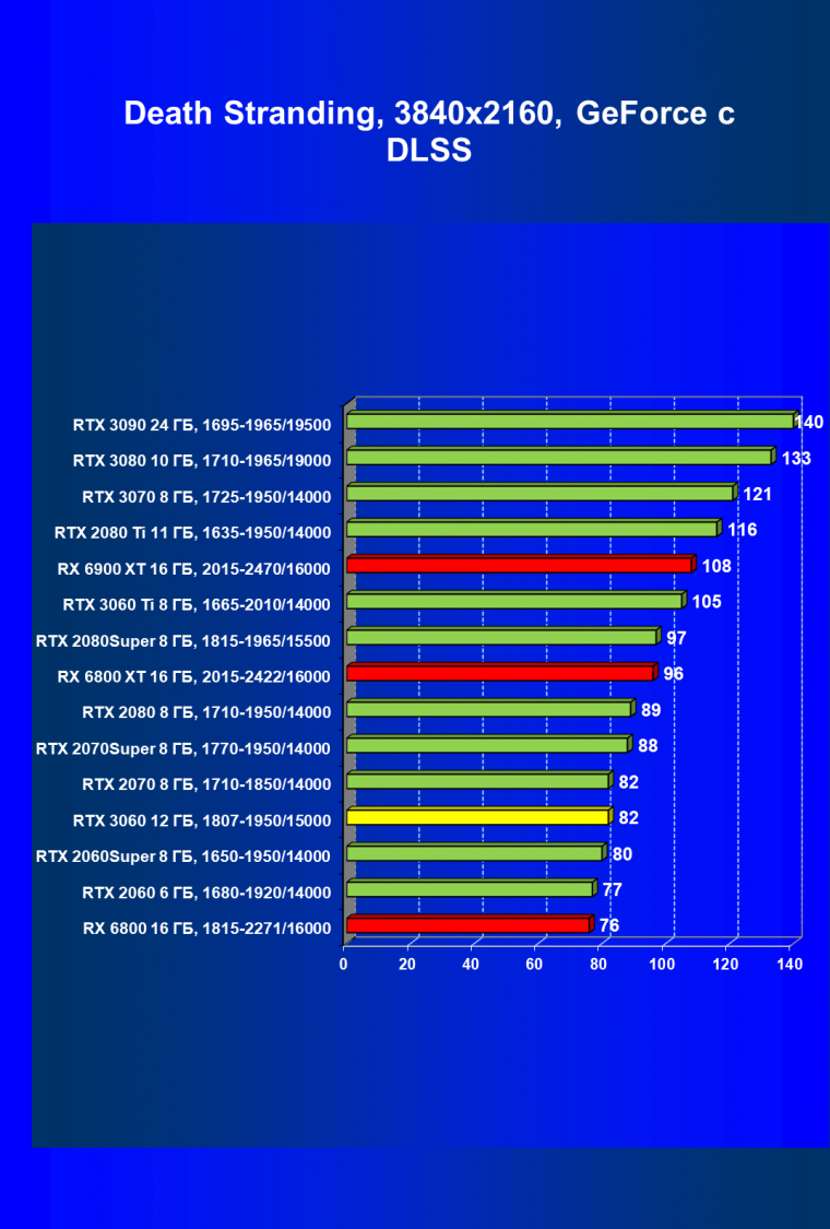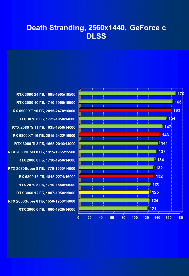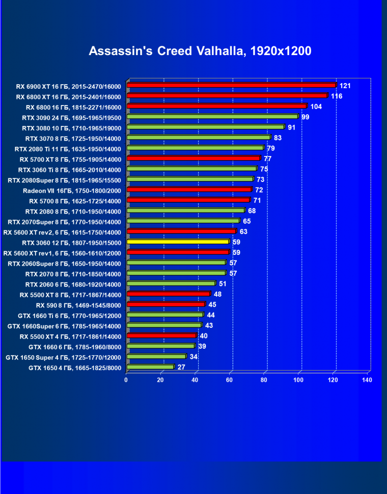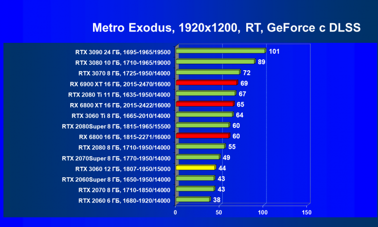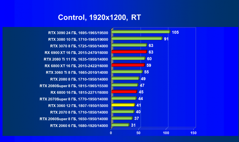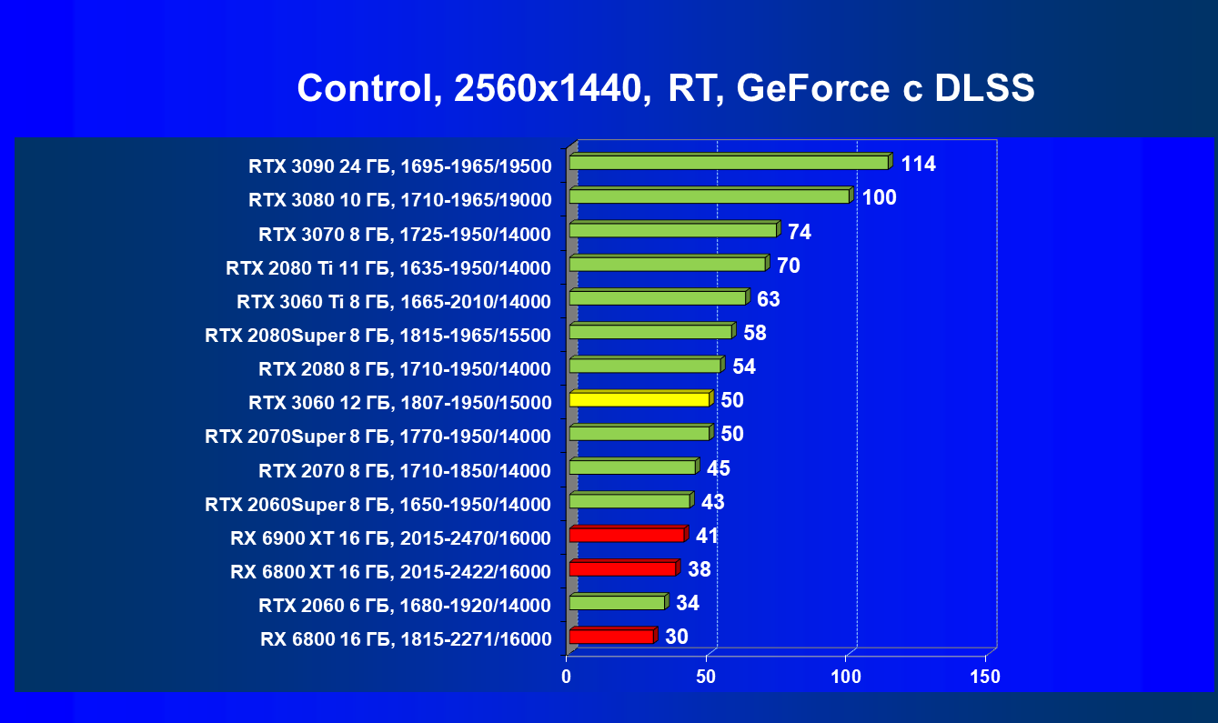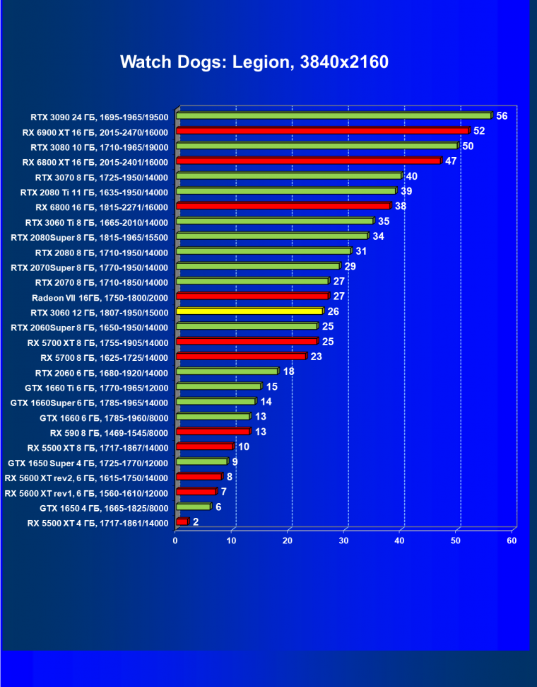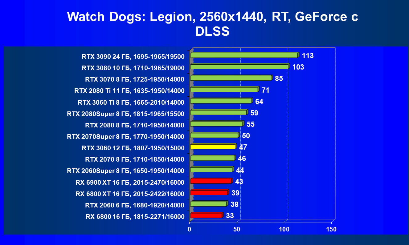 Видеокарты AMD до Radeon RX 6000 здесь по очевидным причинам отсутствуют, а в этом семействе достаточно дешевой (сегодня это слово звучит издевательски по отношению к видеокартам) модели для конкуренции с GeForce RTX 3060 нет. Сравнение с Radeon RX 6800 показало, что несмотря на драматическое падение скорости у этого ускорителя в играх с трассировкой лучей, Radeon RX 6800 все-таки не опускается ниже уровня GeForce RTX 3070. GeForce RTX 3060 здесь полностью повторяет производительность более старшей модели из предыдущего поколения — GeForce RTX 2070 (и немного опережает GeForce RTX 2060 Super).