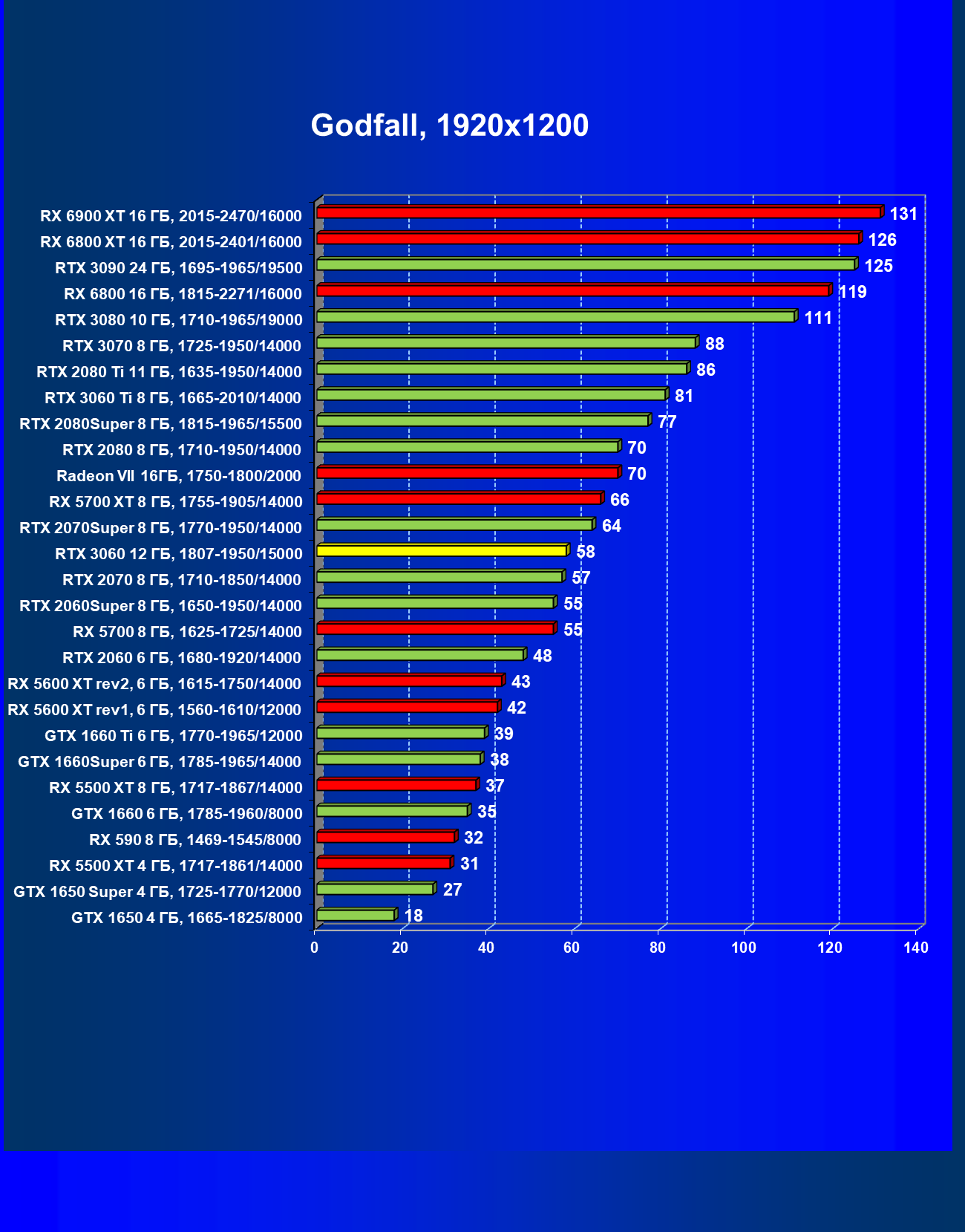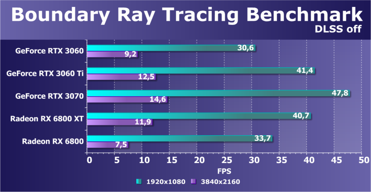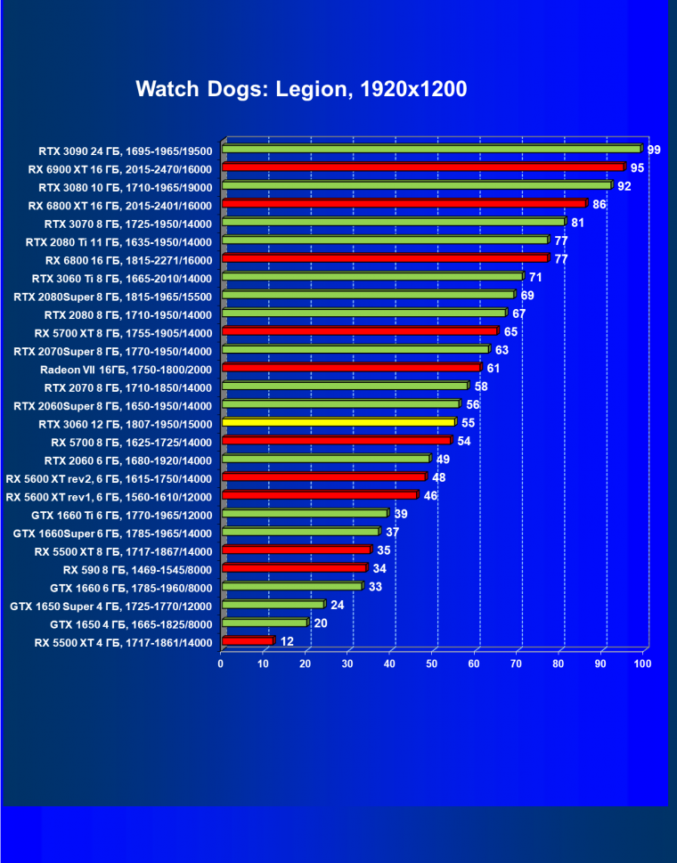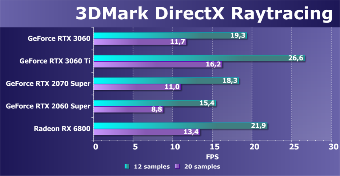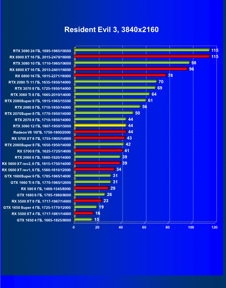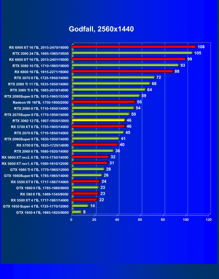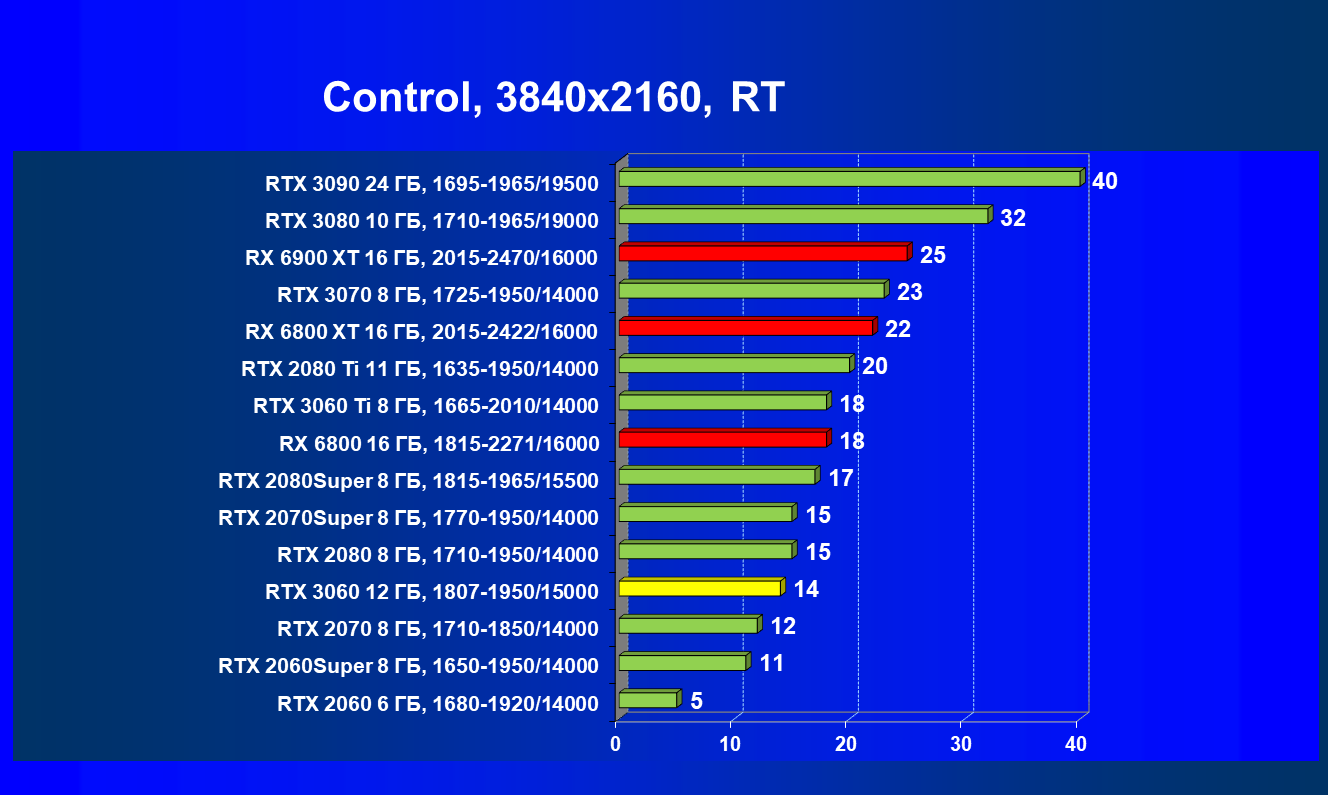 Видеокарты AMD до Radeon RX 6000 здесь по очевидным причинам отсутствуют, а в этом семействе достаточно дешевой (сегодня это слово звучит издевательски по отношению к видеокартам) модели для конкуренции с GeForce RTX 3060 нет. Сравнение с Radeon RX 6800 показало, что несмотря на драматическое падение скорости у этого ускорителя в играх с трассировкой лучей, Radeon RX 6800 все-таки не опускается ниже уровня GeForce RTX 3070. GeForce RTX 3060 здесь полностью повторяет производительность более старшей модели из предыдущего поколения — GeForce RTX 2070 (и немного опережает GeForce RTX 2060 Super).