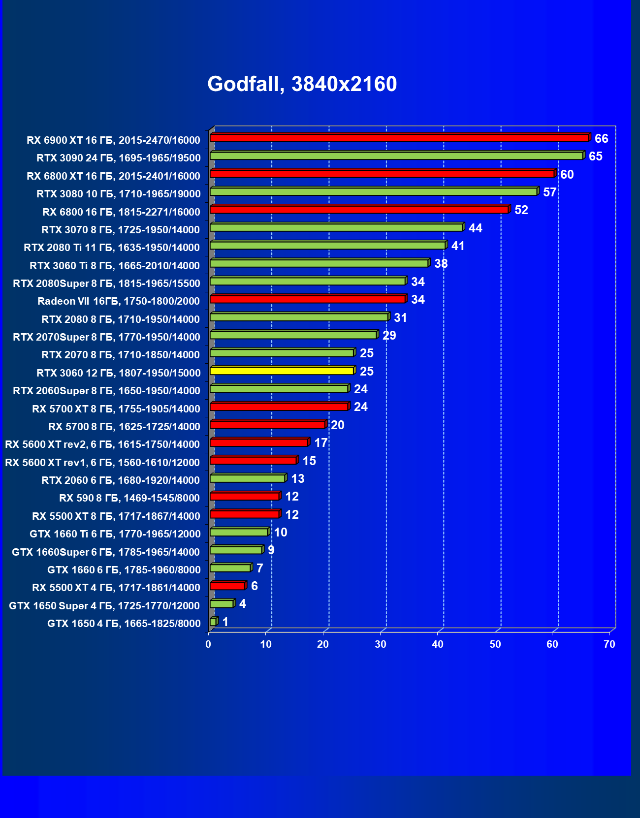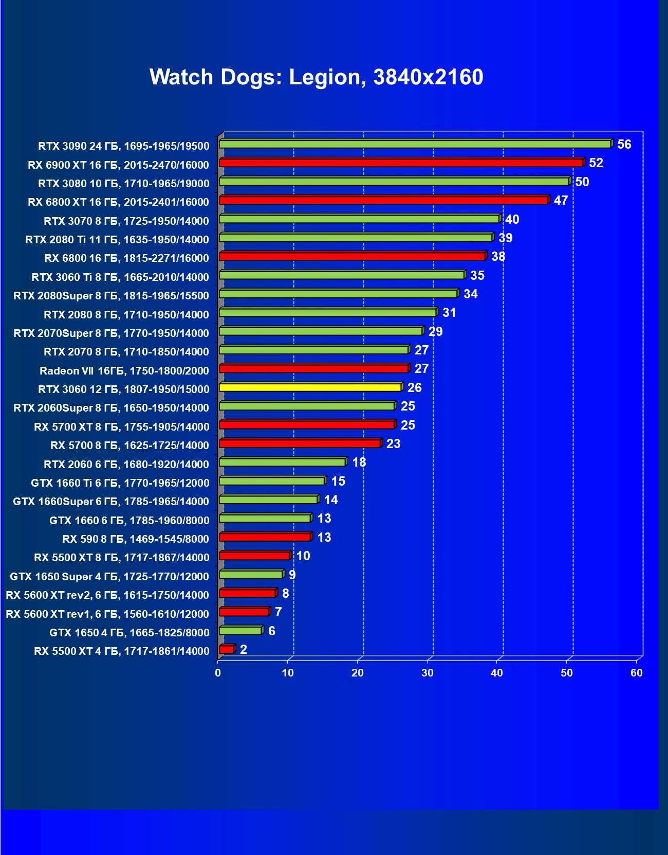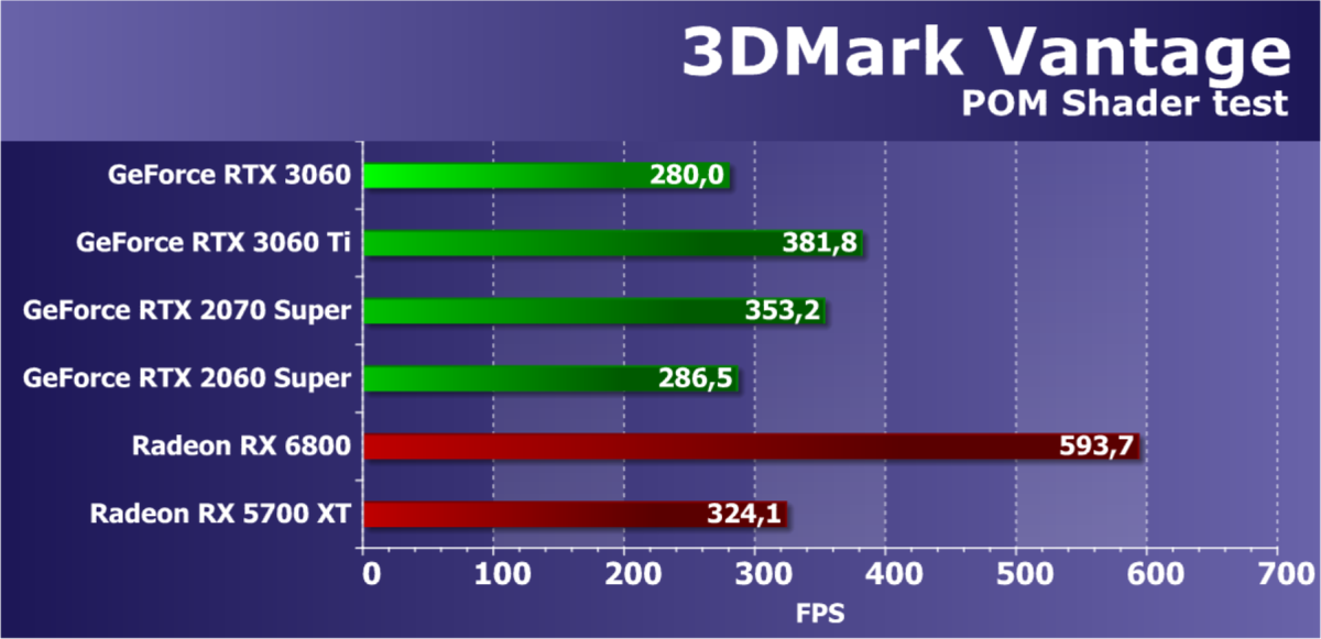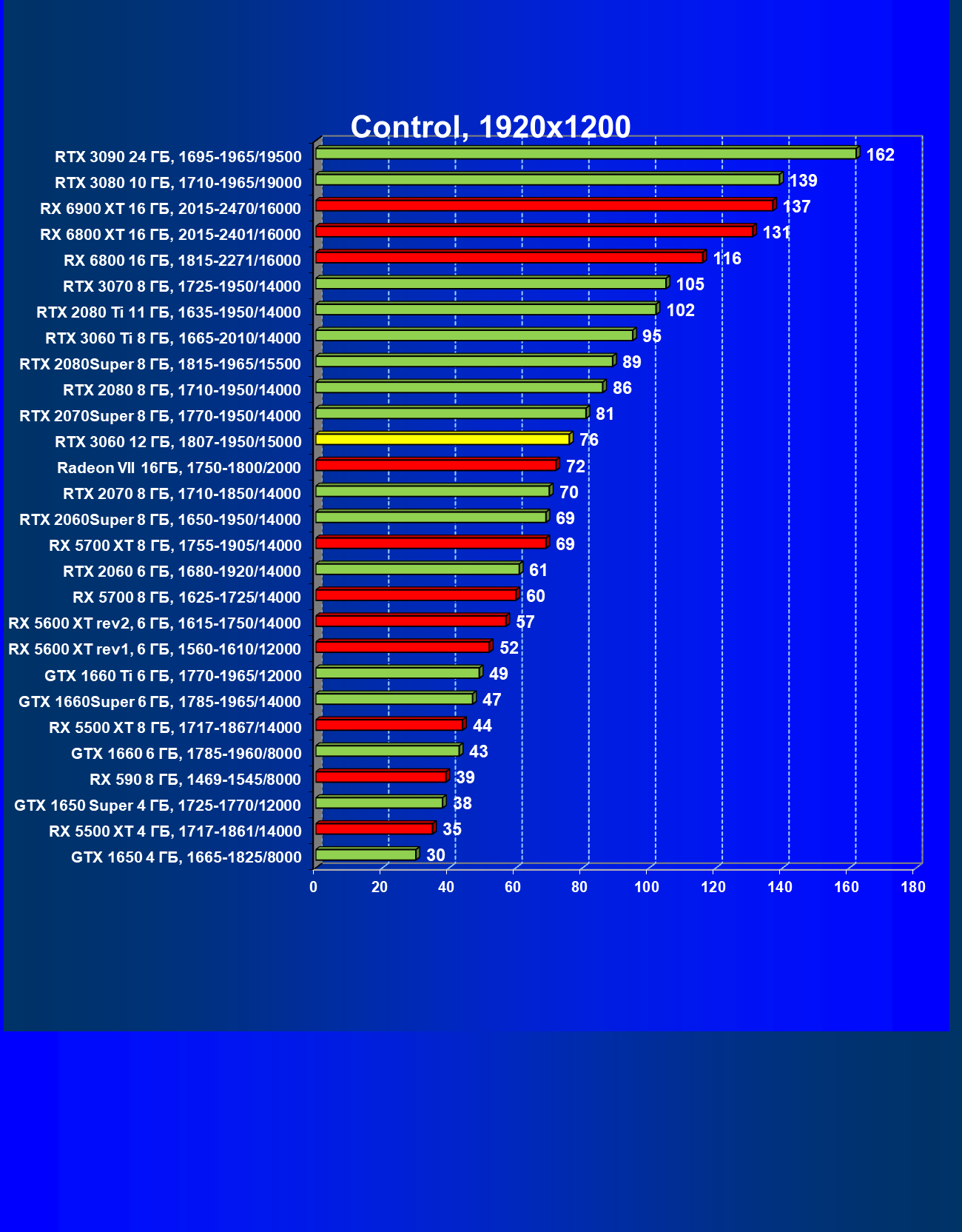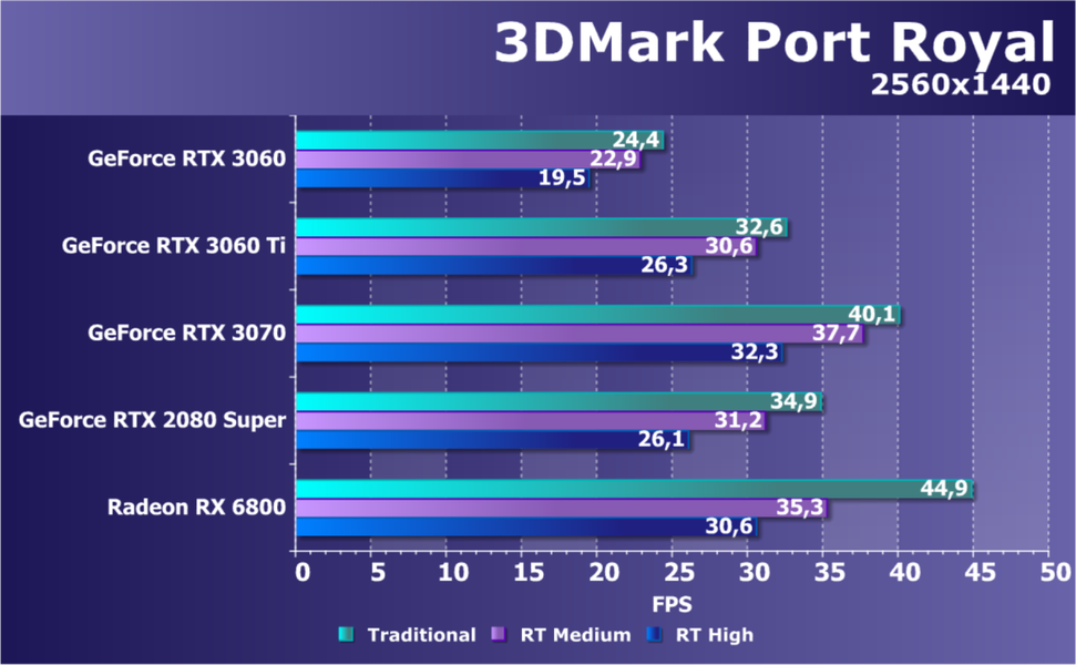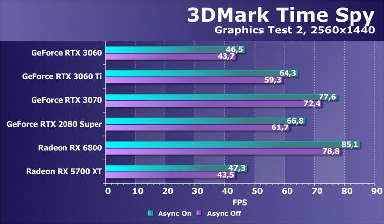 Видеокарты AMD до Radeon RX 6000 здесь по очевидным причинам отсутствуют, а в этом семействе достаточно дешевой (сегодня это слово звучит издевательски по отношению к видеокартам) модели для конкуренции с GeForce RTX 3060 нет. Сравнение с Radeon RX 6800 показало, что несмотря на драматическое падение скорости у этого ускорителя в играх с трассировкой лучей, Radeon RX 6800 все-таки не опускается ниже уровня GeForce RTX 3070. GeForce RTX 3060 здесь полностью повторяет производительность более старшей модели из предыдущего поколения — GeForce RTX 2070 (и немного опережает GeForce RTX 2060 Super).