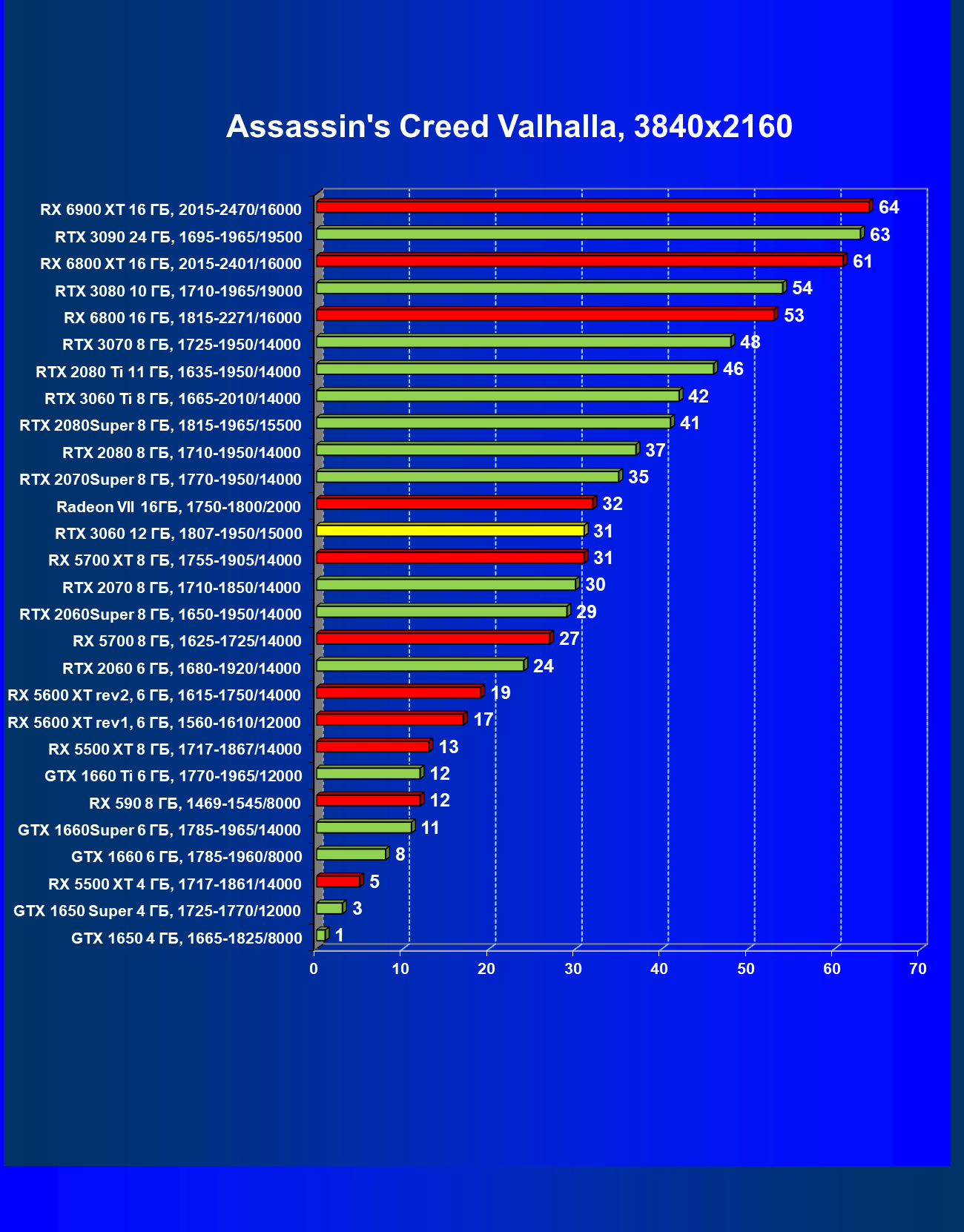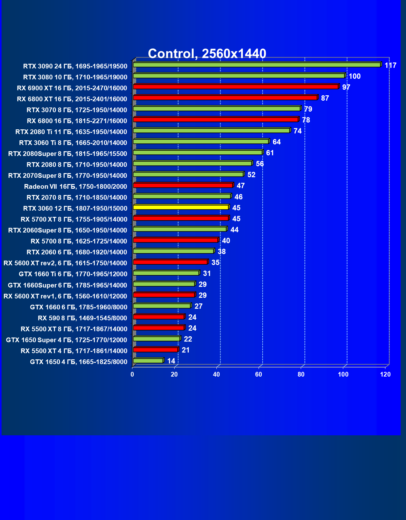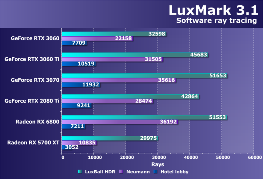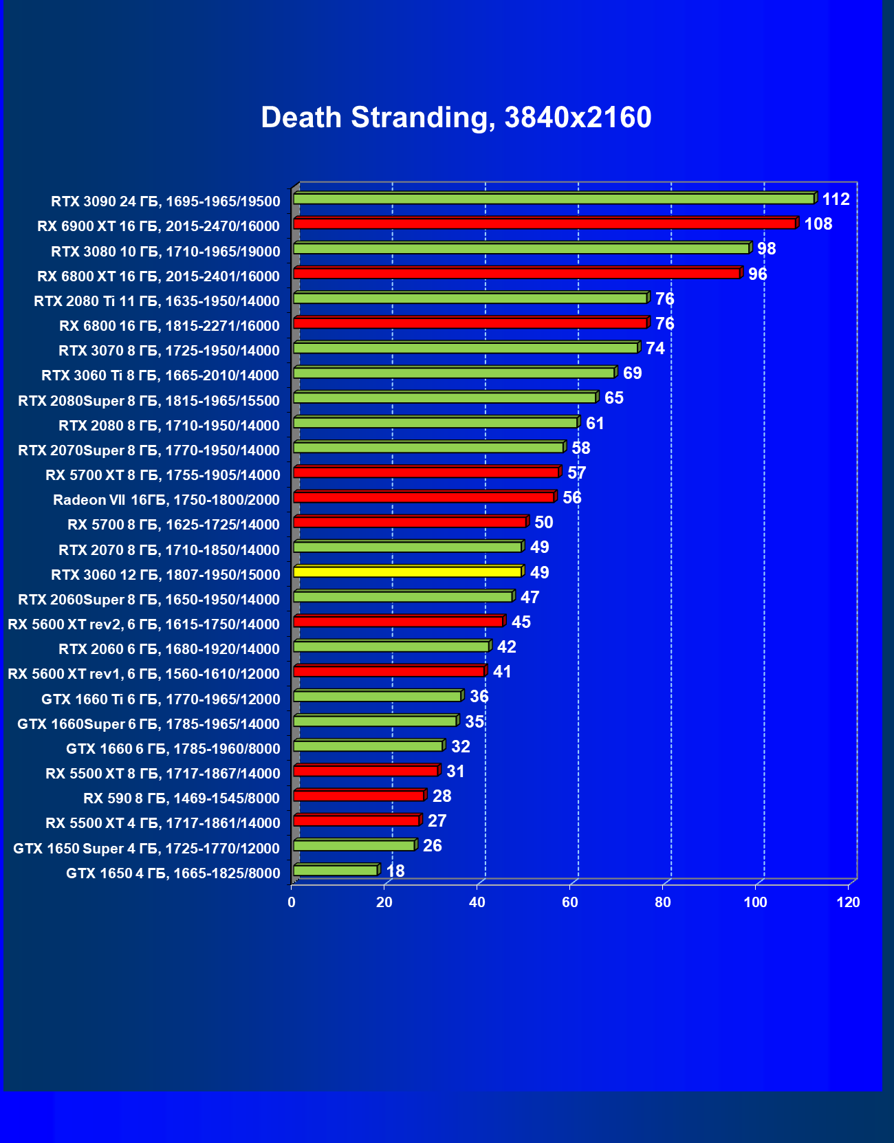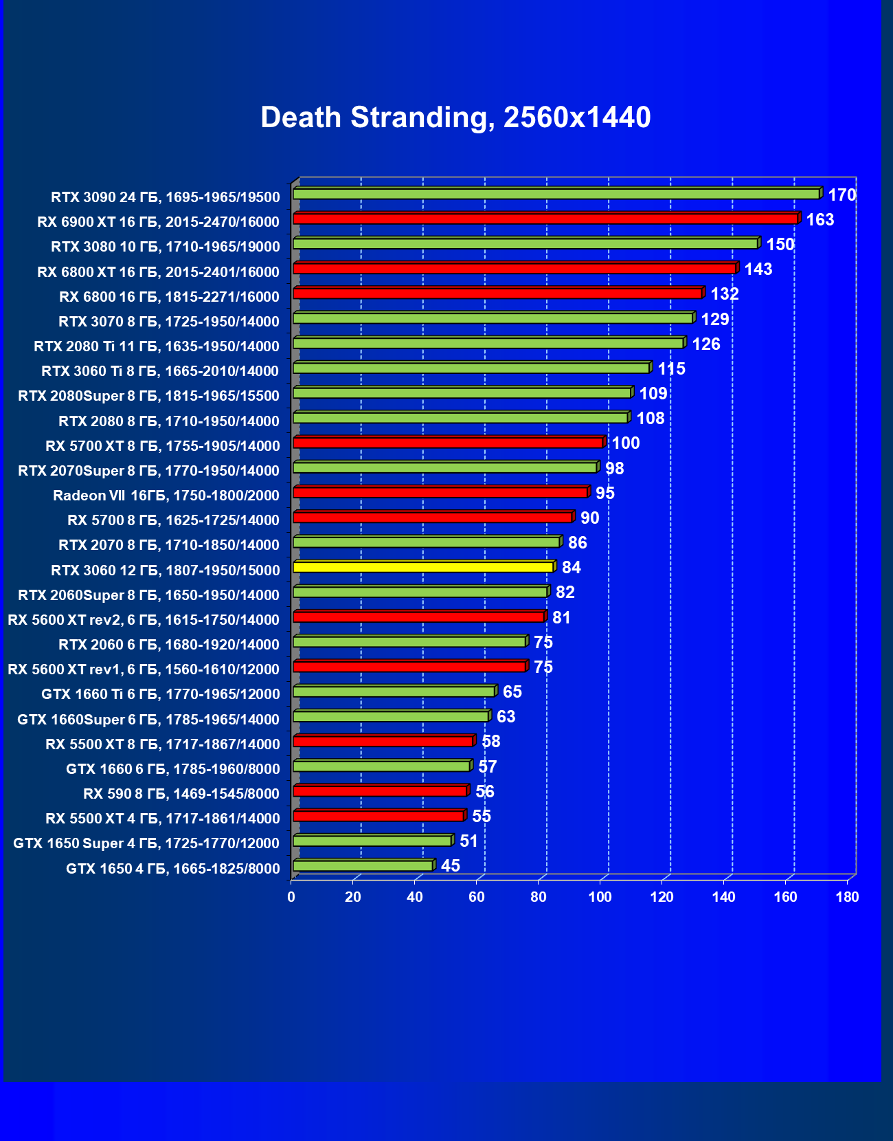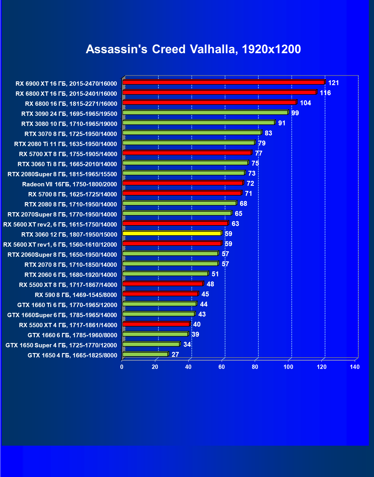 Видеокарты AMD до Radeon RX 6000 здесь по очевидным причинам отсутствуют, а в этом семействе достаточно дешевой (сегодня это слово звучит издевательски по отношению к видеокартам) модели для конкуренции с GeForce RTX 3060 нет. Сравнение с Radeon RX 6800 показало, что несмотря на драматическое падение скорости у этого ускорителя в играх с трассировкой лучей, Radeon RX 6800 все-таки не опускается ниже уровня GeForce RTX 3070. GeForce RTX 3060 здесь полностью повторяет производительность более старшей модели из предыдущего поколения — GeForce RTX 2070 (и немного опережает GeForce RTX 2060 Super).