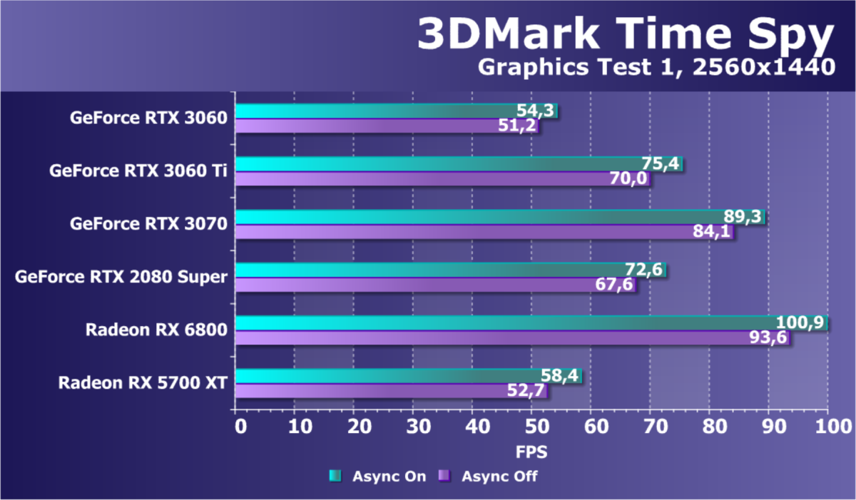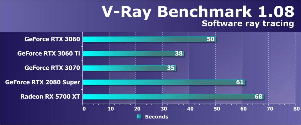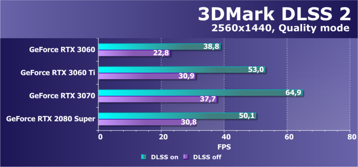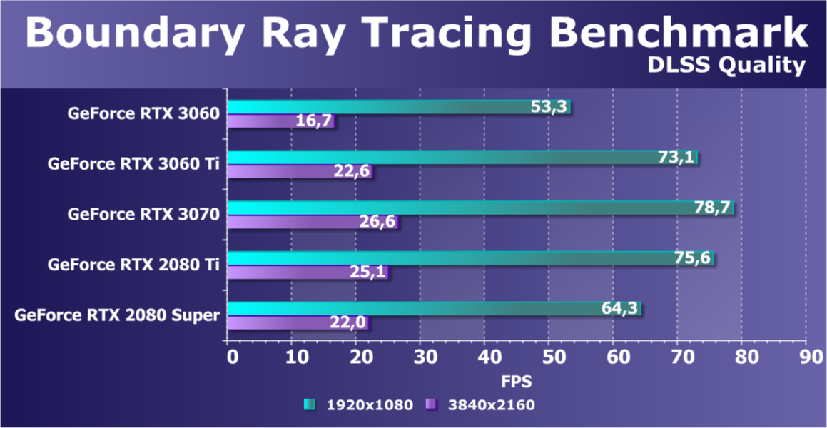 Как и в случаях с более старшими ускорителями новой серии, GeForce RTX 3060 реализует в играх все преимущества технологии трассировки лучей в сочетании с DLSS. И в том же разрешении Full HD производительность GeForce RTX 3060 при включении RT+DLSS является более чем достаточной. Да и без DLSS во многих играх с RT новинка показывает приличную скорость. GeForce RTX 3060 является прямым конкурентом ускорителю Radeon RX 5700 XT и прошлым GeForce RTX 2070 и GeForce RTX 2060 Super (напомним, что вскоре у AMD выходят новые решения для этой ниши в виде Radeon RX 6700/6700 XT). Также можно наглядно видеть, что между GeForce RTX 3060 Ti и GeForce RTX 3060 заложен приличный разрыв в производительности, который может быть использован в будущем для выпуска очередного промежуточного решения.