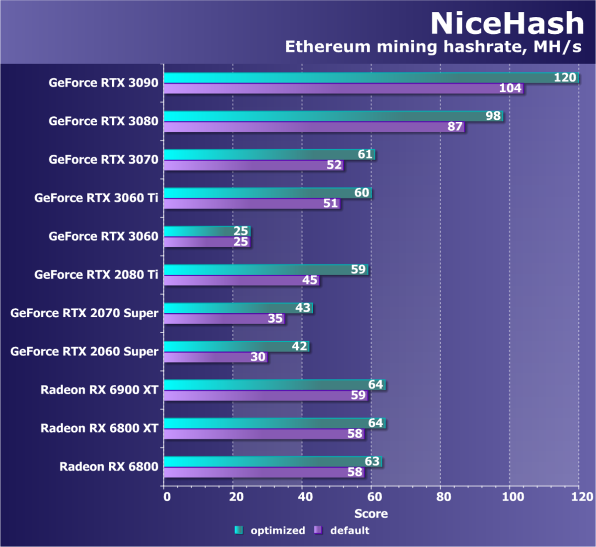 | 25 | RX 5700 8 ГБ, 1625—1725/14000 | 40 | 360 | 90 000 |