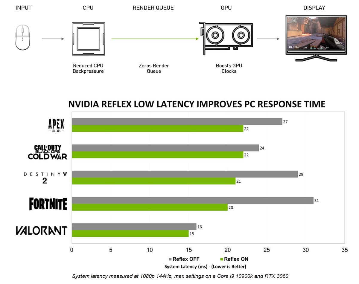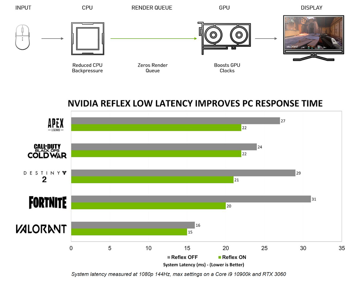 Технология Reflex Low-Latency, встроенная в популярные киберспортивные игры, вроде Apex Legends, Call of Duty: Warzone, Destiny 2, Fortnite и Valorant, значительно снижает задержки. Причем, технология не является уникальной только для решений на базе архитектуры Ampere, а работает на всех видеокартах компании Nvidia, начиная с серии GeForce GTX 900. Собственно, у Nvidia уже есть целый набор технологий, предназначенных для снижения задержек и улучшения комфорта при игре, это Reflex, DLSS и G-Sync — все они работают в связке и обеспечивают максимальную плавность и точность.