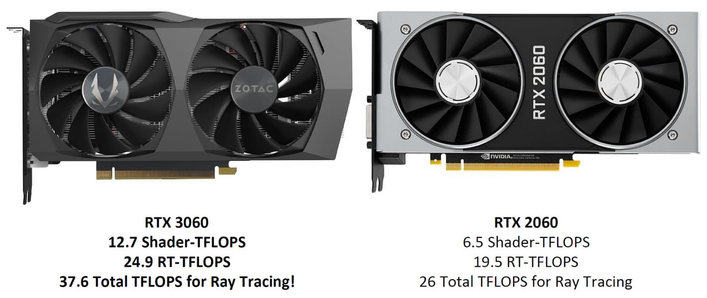 Давайте еще кратко сравним некоторые теоретические показатели производительности GeForce RTX 3060 и RTX 2060 — это даст нам понимание того, насколько быстрее стало решение нового семейства по сравнению с аналогичной картой из предыдущего поколения. Заодно оценим теоретическую разницу по сравнению с RTX 3060 Ti и даже GTX 1060.