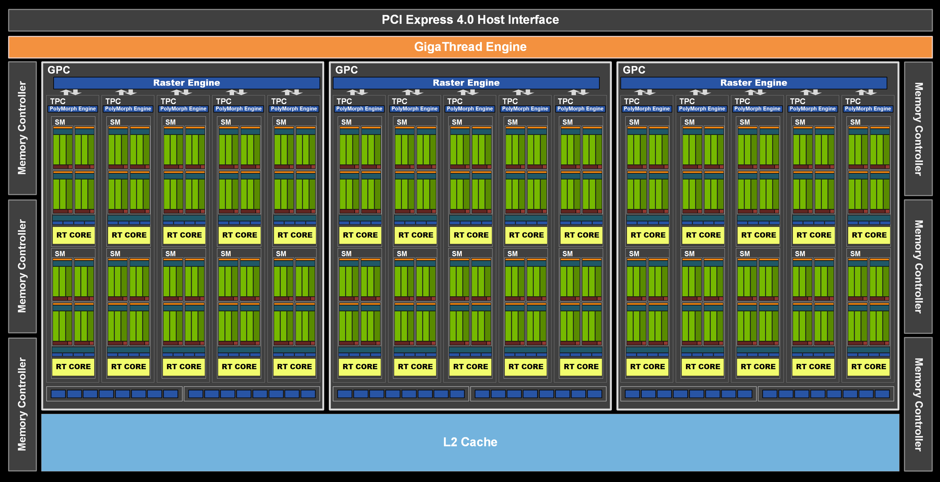 Как и все графические процессоры компании Nvidia, чип GA106 состоит из укрупненных кластеров Graphics Processing Cluster (GPC), которые включают несколько кластеров текстурной обработки Texture Processing Cluster (TPC), содержащих потоковые процессоры Streaming Multiprocessor (SM), блоки растеризации Raster Operator (ROP) и контроллеры памяти. Полный чип GA106, схему которого мы видим ниже, содержит три кластера GPC и 30 мультипроцессоров SM — по 10 штук на каждый кластер, а не по 8, как в GA104. GPC содержит по пять TPC (в GA104 было по четыре), состоящих из пары SM и движка PolyMorph Engine для работы с геометрией.