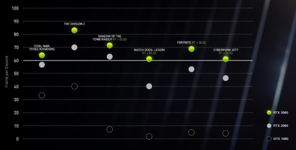 Если сравнивать с еще более старой видеокартой GTX 1060, то Nvidia говорит о двукратной разнице в производительности. Также у новинки вдвое больше видеопамяти, что может быть полезно в будущих играх и приложениях по созданию цифрового контента, а скорость трассировки на ней в 10 раз выше, чем у GTX 1060, чип которой не имеет специализированных RT-ядер (а на RTX 3060 уже второе поколение таких ядер).