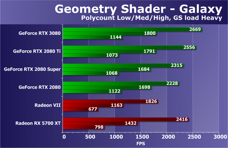 Скорость рендеринга в этом тесте должна зависеть сразу от нескольких параметров, и основными факторами влияния должны являться производительность обработки геометрии и эффективность выполнения геометрических шейдеров. Сильные стороны чипов Nvidia должны были проявиться, но мы в который раз получаем явно некорректные результаты в этом тесте. Смотреть на результаты видеокарт всех GeForce просто нет смысла, они попросту неверны. И модель RTX 3080 ничего не изменила.