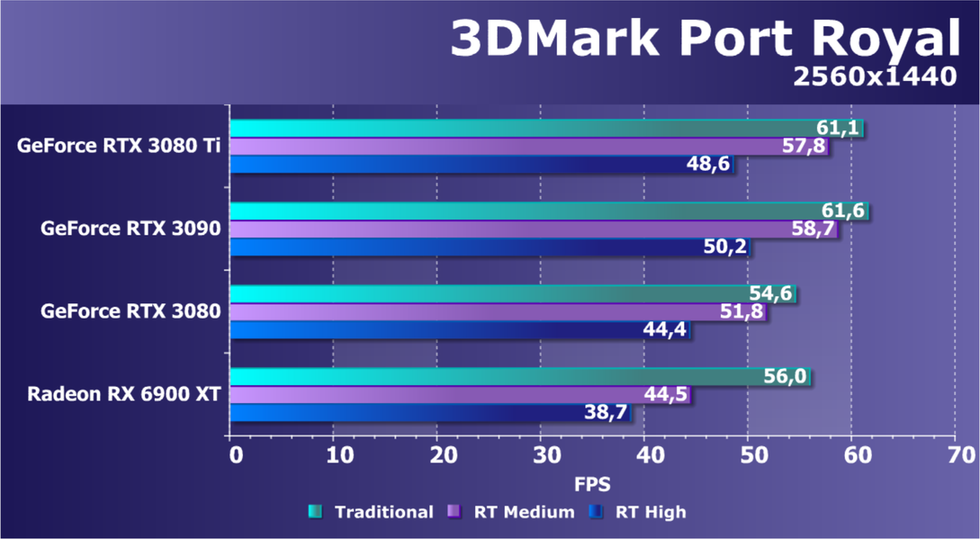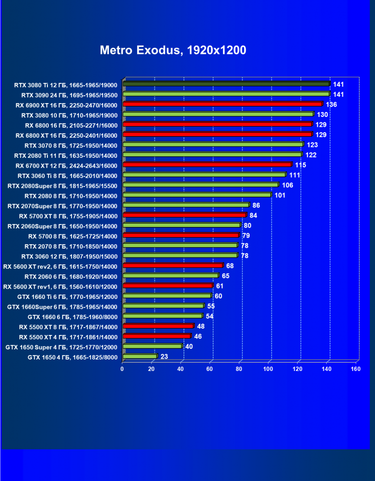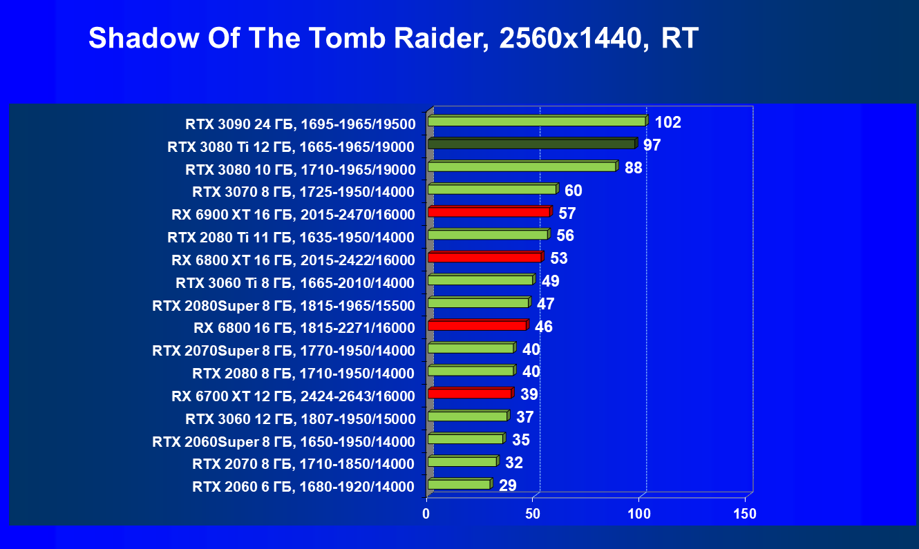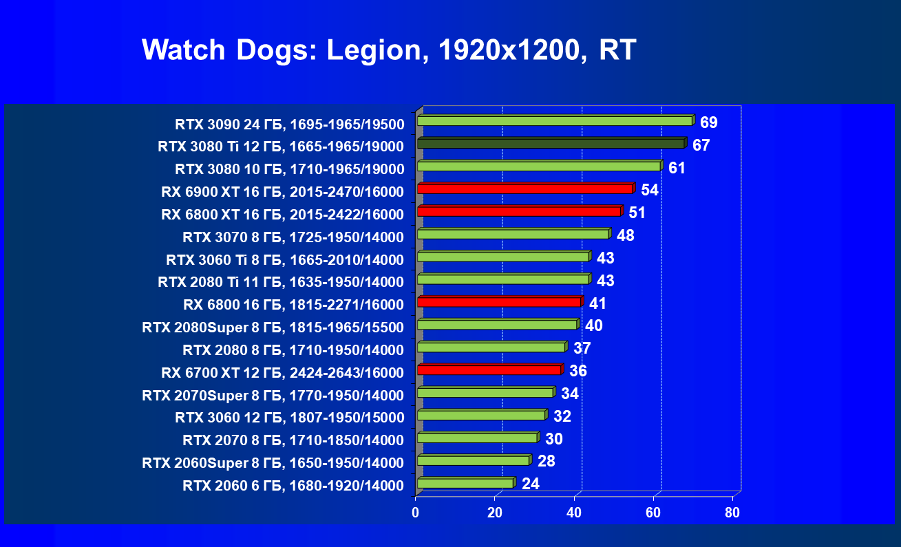 В целом RTX 3080 Ti лишь чуть-чуть не догнал самого старшего собрата RTX 3090 (хотя в ряде игр и разрешений они шли наравне), прилично оторвавшись от RTX 3080. Поэтому логично уже будет сравнить RTX 3080 Ti с RX 6900 XT, а не с 6800 XT.