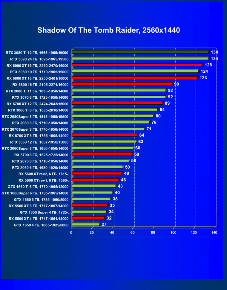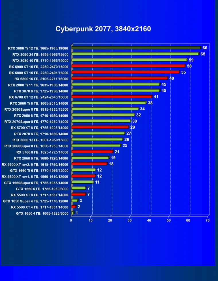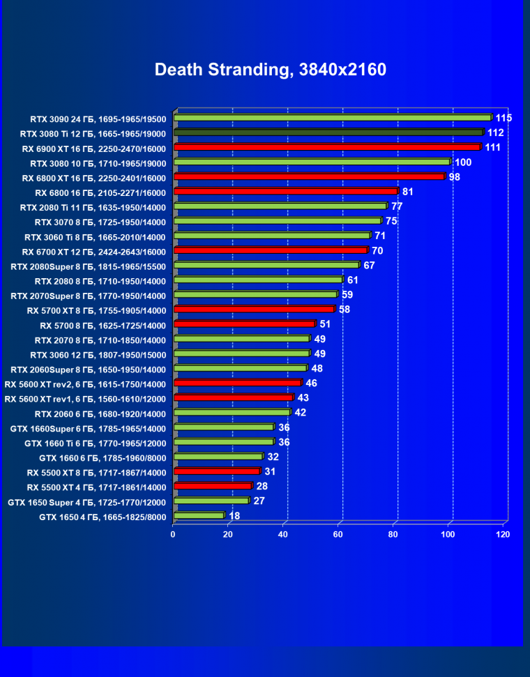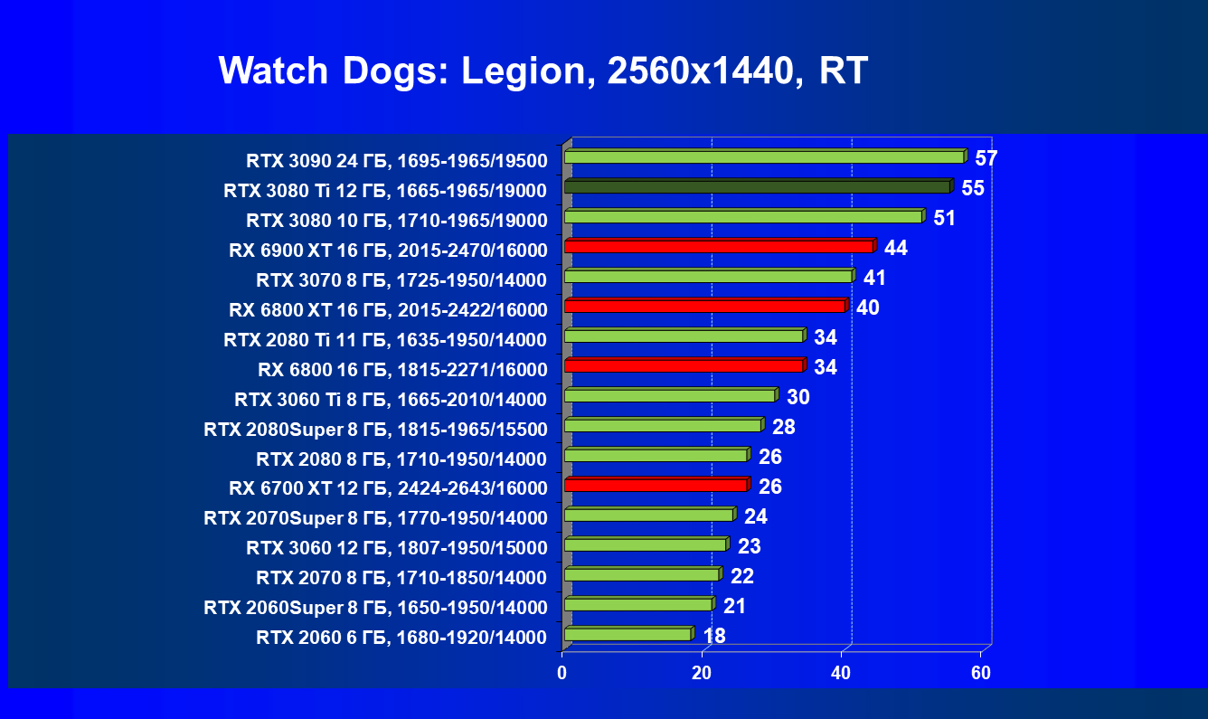 В целом RTX 3080 Ti лишь чуть-чуть не догнал самого старшего собрата RTX 3090 (хотя в ряде игр и разрешений они шли наравне), прилично оторвавшись от RTX 3080. Поэтому логично уже будет сравнить RTX 3080 Ti с RX 6900 XT, а не с 6800 XT.