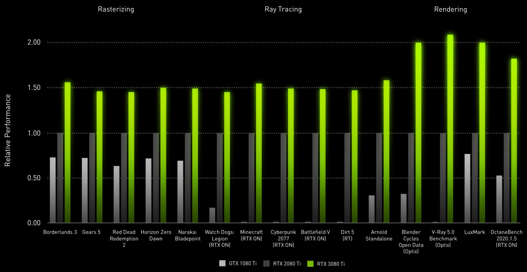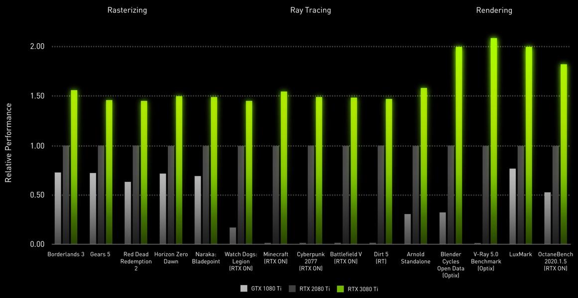 А по сравнению с GTX 1080 Ti, которая и сегодня остается очень мощной видеокартой, новинка RTX 3080 Ti дает вдвое более высокую производительность при традиционной растеризации, и много быстрее ее при трассировке лучей, которая еще и не всегда поддерживается играми в случае GTX 1080 Ti. Это довольно большой шаг в скорости и качестве рендеринга. А если вспомнить технологию улучшения производительности DLSS, которая также поддерживается новинкой, то ее отрывы от GTX 1080 Ti могут быть еще больше.